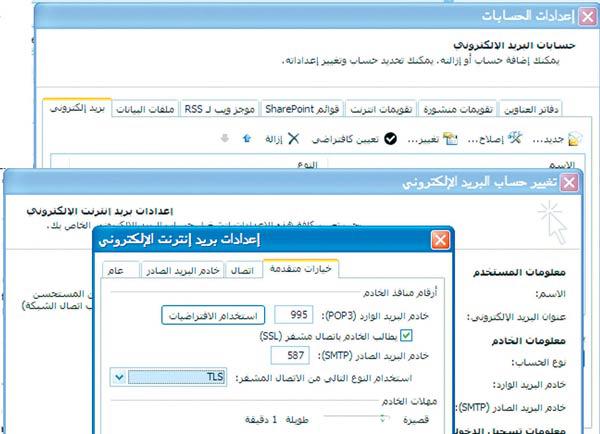 إعداد الحسابلتلقي بريد Gmail عبر برنامجOutlook 2007 يتوجب عليك بداية إعداد الحساب المعتمد لتحويل بريدك الإلكتروني إلى هذا البرنامج وفق بروتوكول POP3، لذلك توجه إلى الحساب الخاص بك ومن القائمة العلوية أنقر على ضبط (Settings) ثم ضمن التبويبات المتوافرة في الصفحة الجديدة توجه إلى خيار إعادة التوجيه والوصول عبر POP/IMAP (Forwarding and POP/IMAP) وضع إشارة تأكيد بجانب خيار تمكين بروتوكول POP لرسائل البريد التي تصل من الآن فصاعدًا (Enable POP for mail that arrives from now on) المتوافر تحت عنوان تنزيل بروتوكول POP في حال فضلت عدم تنزيل الرسائل البريدية القديمة الموجودة ضمن البريد الوارد، أما إذا فضلت إنشاء نسخة إضافية على قرص كمبيوترك الصلب عن جميع الرسائل المتوافرة ضمن البريد الوارد فيجدر اختيار تمكين بروتوكول POP لكل البريد (Enable POP for all mail) ثم أكد خيارك بالضغط على حفظ التغيرات (Save changes). كذلك يمكن اختيار من ضمن القائمة المنزلقة المتوافرة إمكانية ترك الرسائل البريدية ضمن حسابك بعد التحقق منها بواسطة برنامج ميكروسوفتOutlook 2007 أو حتى حذفها أو أرشفتها ضمن حساب الـGmail.بعد الانتهاء من إعداد حساب الـGmail الخاص بك أطلق برنامج ميكروسوفت Outlook وتوجّه إلى أدوات (Tools) وضمن القائمة المنبثقة أنقر على إعدادات الحساب (Account Settings) ثم جديد (New) وضمن النافذة الجديدة المنبثقة ضع إشارة تأكيد بجانب خيار Microsoft Exchange أو POP3 أو IMAP أو HTTP وانقر على التالي. ضمن النافذة الجديدة أذكر اسمك وعنوان بريد الـGmail خاصتك وكلمة المرور المعتمدة ثم ضع إشارة تأكيد بجانب خيار تكوين إعدادات الخادم أو أنواع الخوادم يدوياً (Manually configure server settings or aditional server type) واضغط على التالي. في النافذة الجديدة اختر البريد الالكتروني وانقر مجدداً على التالي، ستظهر نافذة جديدة تمكّن من اختيار إعدادات الحساب، تأكد من توافر POP3 بجانب نوع الحساب (account type) ثم أكتب عبارة pop.gmail.com ضمن المربّع الملازم لخيار خادم البريد الوارد (Incoming mail Server) وعبارة smtp.gmail.com ضمن ذلك الملازم لخيار خادم البريد الصادر (Outgoing mail server). كذلك أذكر مجدداً عنوان بريد الـGmail خاصتك بجانب اسم المستخدم وكلمة المرور المعتمدة تحت عنوان «معلومات تسجيل الدخول» وانقر على مزيد من الإعدادات (More Settings).ضمن النافذة الجديدة المنبثقة توجه إلى تبويب خادم البريد الصادر (Outgoing mail server) وتأكّد من وجود إشارة تأكيد بجانب خيار يطالب خادم البريد الصادر (SMTP) بالمصادقة في جانب خيار استخدام نفس الإعدادات الموجودة على خادم البريد الوارد، ثم توجه إلى تبويب خيارات متقدمة (Advanced) وضع إشارة تأكيد في جانب يطالب الخادم باتصال مشفر (SSL) ثم ضع قيمة 587 في جانب خادم البريد الصادر (SMTP) واختر من القائمة المنبثقة المحاذية لخيار استخدام النوع التالي من الاتصال المشفر عبارة TLS. كذلك تأكد من وجود قيمة 995 في جانب خادم البريد الوارد (POP3) واضغط على موافق ثم في النافذة السابقة اضغط على التالي ثم لاحقاً على إنهاء (finish) لإتمام عملية الإعداد.الرأيعلى الرغم من صعوبة وتعقيدات عملية إعداد برنامج ميكروسوفت Outlook 2007 لاستقبال بريد الـGmail خاصتك إلا أنه من دون أدنى شك يفعل ويسهل عملية التعامل اليومية مع هذا البريد خصوصاً للمستخدم المتنقل الذي يفتقد إلى الاتصال المستمر بالشبكة.