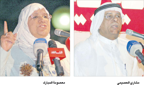 وقال العصيمي، في الكلمة التي ألقاها أمام المعتصمين في ساحة الإرادة مساء أمس الأول تعبيرا عن استيائهم من «الدعوات التكفيرية»، رافعين شعار: «لا للتكفيريين... وقفة لرفض عبث بعض التيارات المتأسلمة باسم الدين»، إن «الإسلام ليس له علاقة بالدستور»، لافتا إلى أنه إذا رضخنا لهم في تطبيق المادة الثانية فمعنى ذلك أننا يجب علينا الرضوخ في كل مرة، ومن هنا فقد رفضت التوقيع، وكرروا هذا الموضوع في مجلس 1985، متسائلا مَن مِن المرشحين الإسلاميين يرفع الآن تطبيق المادة الثانية من الدستور؟، مما يدل على أن القضية مكاسب انتخابية وشخصية ليس إلا، مؤكدا أن الموعد يوم السبت المقبل مع وصول المرأة إلى قبة البرلمان.تهميش المرأة ومن جانبها، قالت الوزيرة السابقة ومرشحة الدائرة الأولى د. معصومة المبارك إن «المتشددين يستخدمون الدين لتهميش المرأة والديمقراطية»، مضيفة أن «المخربين للديمقراطية والعابثين بها يستخدمون الدين لتحقيق مصالح ومآرب انتخابية، وأنهم يحاولون العبث بالعرس الديمقراطي الذي تعيشه الكويت من خلال إصدار فتوى تدعو إلى عدم التصويت للمرأة في الانتخابات البرلمانية المقبلة».وقالت: إن «هذه ليست هي المرة الأولى التي يصدر فيها تيار الإسلام السياسي بيانات وممارسات ضد المرأة»، لافتة إلى «أننا نعاني هذه الممارسات منذ ثمانينيات القرن الماضي»، موضحة أن التيارات المتشددة منذ عام 1971 وهي تستخدم الدين لتهميش المرأة والديمقراطية وإصدار الفتاوى التي تحط من قدر المرأة وشأنها، مشيرة إلى أن تعطُّل الحق السياسي للمرأة على مدى سنوات عديدة يرجع إلى فتاوى لا تقوم على أسس دينية، ولكن على أسس المصلحة الشخصية والمنافع الذاتية، لافتة إلى أنه في عام 2006 صدرت فتوى أخرى بتهميش المرأة وجعل دورها تابعا لا قائداً وحراً ومستقلا، حيث تقول الفتوى «آثمة من تمارس حقها في التصويت دون رضى ولي الأمر (الزوج، الأب، الأخ)». لافتة إلى أنهم يوظفون الدين لأغراض مصلحية، ونقول لهم كفانا عبثا بالديمقراطية وتهميشا للإرادة، وعلينا جميعا أن نقف وقفة صامدة وعلينا ألا نتراجع أو نتكاسل في وجه هذه الفتاوى. وقالت معصومة المبارك إننا أمام منعطف خطير، مشددة على أن الدين والديمقراطية ليسا عبثا، ولابد من أن نضع مصلحة الكويت قبل أي شيء آخر، داعية إلى أن نقف جميعا ونردد «لا للتكفيريين فنحن نعرف ديننا، ولا نريد أحدا أن يثقفنا بثقافته». جماعات كاذبة ومن جانبه، قال ممثل التحالف الوطني الديمقراطي أنور جمعة، إن «السلف والإخوان المسلمين، جماعات إسلامية كاذبة وملفقة، وجهتها المال والسلطة»، داعيا الدولة إلى «ملاحقة هذه العناصر والجماعات والتأكد من أنها لا تسعى إلى إلا السلطة»، مشيرا إلى أنه لن يخاطب هذه الجماعات بحياء لأنهم خاطبوا وطنيين ووطنيات دون حياء، مشددا على أن الفكر التكفيري بدأ بفتاوى، ومن ثم قاموا باغتصاب السلطة كما حدث في بعض الدول، موجها خطابه إلى الحضور قائلا: «يا إخوان القضية ليست أسيل العوضي أو معصومة المبارك أو غيرهما، القضية تكمن في استقرار الوطن وأمنه، ويجب أن نتعامل مع هذه الفتاوى بشكل من الحذر»، داعيا الشعب الكويتي إلى «التجمع عند إصدار هذه الجماعات أي بيان خارج على القيم»، وأن نرفع صوتنا وموقفنا في وجوه هؤلاء، مناشدا رجال الدين كشف هذه الفتاوى، وفضحها أمام الناس.وأكد أن «تيار الإسلام السياسي يحتضر، وانتخابات 2009 وإفرازاتها ستزلزل عروشهم»، موضحا أن «هذه الجماعات لجأت إلى إصدار مثل هذه الفتاوى، لأن أرقام أسيل العوضي أخافتهم، ولأن النواب الوطنيين قادمون إلى المجلس». وتساءل جمعة: «أين فتاواكم ممن يبيع لحم الخنازير والخمر في متاجره صباحا ثم يصدر الفتاوى في المساء؟ وأين فتاواكم من سراق المال العام الذين يعطونكم الأموال لتسكتوا على سرقاتهم؟ موضحا أن البلد مخطوف من هذه الجماعات منذ 30 عاما، والتي لا تفقه في الدين شيئا، وغايتها فقط هي السلطة والمال، مؤكدا أن هذه الفتوى خرجت الآن لأن الوطنيين قادمون إلى المجلس، 