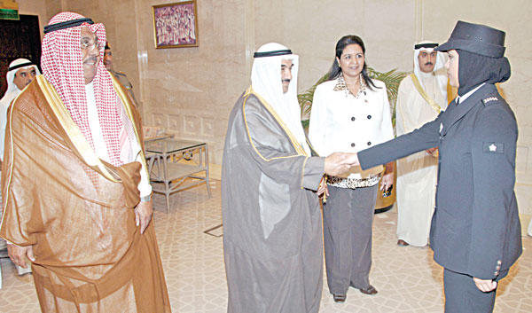 الى ذلك استقبل سمو الشيخ ناصر المحمد رئيس مجلس الوزراء في قصر السيف أمس وبحضور وزير الداخلية الشيخ جابر الخالد مساعد مدير عام أكاديمية سعد العبدالله للعلوم الامنية دلال الرويشد وخريجات الدفعة الاولى لمعهد الهيئة المساندة بالاكاديمية.وأعرب سموه خلال اللقاء عن سعادته بدخول المرأة الكويتية مجال السلك العسكري لتشارك الى جانب اخوانها الرجال بفعالية وكفاءة في تحقيق الامن والاستقرار في البلاد تحت ظل رعاية سمو أمير البلاد الشيخ صباح الاحمد وسمو ولي العهد الشيخ نواف الاحمد. وأشاد سموه بالخريجات من الدفعة الاولى من الشرطة النسائية وما قمن به من جهد واضح في حفظ النظام والامن خلال عملية الاقتراع لانتخابات مجلس الامة التي جرت يوم السبت الماضي.وأعرب سموه عن أمله في انضمام المزيد من بنات الكويت الى مختلف المجالات وافرع الامن، مؤكدا ان الشرطة النسائية تبرز الوجه الحضاري المشرق لدولة الكويت وتؤكد حرص ابنائها جميعا على بذل الغالي والنفيس من اجل تحقيق العزة والتقدم لوطنهم.كما اشاد سموه بالجهاز التدريبي من الشرطة النسائية في مملكة البحرين الشقيقة اللواتي ساهمن بفعالية في تدريب واعداد افراد الضباط وضباط الصف خريجات الدفعة الاولى.... ويعود رجا الحباج في «العدان» قام سمو الشيخ ناصر المحمد رئيس مجلس الوزراء امس بزيارة عضو المجلس البلدي السابق رجا الحباج العازمي الذي يرقد حاليا في قسم العناية المركزة في مستشفى العدان. ونقل سمو الشيخ ناصر المحمد له تحيات وتمنيات سمو امير البلاد الشيخ صباح الاحمد وسمو ولي العهد الشيح نواف الاحمد بالشفاء العاجل وموفور الصحة رافق سموه خلال زيارته وزير الدولة لشؤون الاسكان ووزير الدولة لشؤون التنمية ووزير الصحة الدكتورة موضي الحمود ووكيل وزارة الصحة الدكتور ابراهيم العبدالهادي ومحافظ الاحمدي الشيخ الدكتور ابراهيم الدعيج.