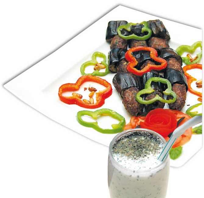 المكونات - الكمية- باذنجان طويل عدد 1- لحم هبرة 400 غ- ملح ملعقة صغيرة- فلفل أبيض ملعقة صغيرة- بقدونس باقة - طماطم 300غ- بصل 150 غالطريقة 1. افرمي اللحمة لتصبح ناعمة جدا.2. افرمي البقدونس ليصبح ناعمًا أيضا، وافرمي الطماطم والبصل.3. اخلطي اللحمة مع البقدونس والطماطم والبصل جيدا ورشي الملح والفلفل الأبيض على المزيج واخلطيه جيدا.4. قطعي الباذنجان إلى قطع مربعة. ضعي الباذنجان واللحم في أسياخ بشكل متتال. 5. ضعي الأسياخ على فحم حامٍ.6. اخلطي اللبن طازجًا مع النعناع الجاف جيدا في الخلاط، واخفقيه في الماء وقدميه مع الكباب.