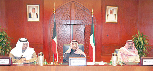 التقى سمو أمير البلاد الشيخ صباح الأحمد، صباح أمس في قصر السيف، سمو ولي العهد الشيخ نواف الأحمد وسمو رئيس مجلس الوزراء الشيخ ناصر المحمد وأعضاء الحكومة الجديدة بعد اداء اليمين الدستورية أمام سموه. وعقب الاجتماع صرح نائب رئيس مجلس الوزراء وزير الدولة لشؤون مجلس الوزراء فيصل الحجي أن سمو الامير وجه في هذا اللقاء كلمة عبر فيها عن تقديره للوزراء لقبولهم المشاركة في تحمل مسؤولية المنصب الوزاري، ثم عقد مجلس الوزراء اجتماعه الأول في مقره بقصر السيف برئاسة الشيخ ناصر المحمد، حيث استهل سموه الاجتماع بكلمة رحب فيها بالوزراء، شاكراً لهم حسن استجابتهم في حمل امانة المنصب الوزاري في هذه المرحلة بتحدياتها المختلفة والجسيمة مشيداً بالتوجيهات السامية التي تضمنتها كلمة صاحب السمو. وأعرب سموه عن امله في ازالة كل ما قد يعترض مسيرة العمل الوطني من توترات قد تضعف جهود امكانات مواجهة التحديات والاخطار الخارجية، مشددا على ضرورة العمل على تضافر كافة الجهود لتعزيز الوحدة الوطنية وتجسيد وترسيخ التعاون الايجابي بين السلطتين التشريعية والتنفيذية لكل ما فيه خدمة الغايات الوطنية.