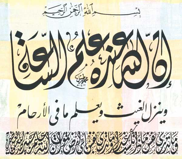 لوحة قرآنية بعدة أنواع من الخطوط العربية، حولها إطار زخرفي من حروف الخط الديواني, وهي عبارة عن (البسملة) بخط النسخ، (إن الله عنده علم الساعة) بالخط الديواني (وينزل الغيث ويعلم ما في الأرحام) بالخط الفارسي، (وما تدري نفس ماذا تكسب غداً وما تدري نفس بأي أرض تموت إن الله عليم خبير) صدق الله العظيم بخط جلي الديواني. وقد عرضت اللوحة بمكتبة الإسكندرية وبعض الدول العربية الأوروبية.