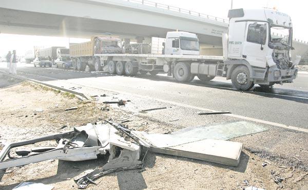 وقع حادث تصادم مركب بين ثلاث شاحنات ومركبتين أدى الى اصابة خمسة أشخاص بجروح خطيرة إضافة الى انحشار احدهم في شاحنته في منطقة الفحيحيل على طريق الملك فهد صباح امس.بدأت سلسلة التصادمات باصطدام قاطرة مسرعة بأخرى متوقفة عند الإشارة نظرا إلى عدم انتباه قائدها الى الاشارة الضوئية، مما أدى إلى اصطدام القاطرة المتوقفة بقاطرة ثالثة متوقفة امامها واحتجاز قائدها داخلها.