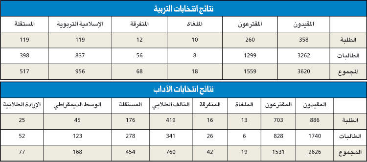 فازت قائمة التآلف الطلابي للمرة الرابعة على التوالي برابطة الآداب وبصندوقي الطلاب والطالبات، بينما حافظت قائمة الإسلامية التربوية على مقاعد جمعيتها في كلية التربية بمجموع 956 صوتاً.حافظت قائمة التآلف الطلابي على رابطة الآداب للمرة الرابعة على التوالي وبمجموع من الأصوات بلغ 760 صوتا، وجاءت المستقلة ثانية بمجموع 454 صوتا، والوسط الديمقراطي ثالثا بمجموع 168 وقائمة الإرادة أخيرة بـ78 صوتا.