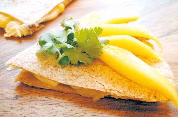 - 4 قطع (20 سنتم) من عجينة التورتيلا المصنوعة من الحبوب الكاملة.- 4 ملاعق صغيرة من الزيت النباتي.- كوب ونصف من جبنة الشيدر المبروشة.- كوب ونصف من الدجاج المطهي المقطع.- حبة مانغا مقشرة، منزوعة النواة ومقطعة.- ¼ كوب من الكزبرة الطازجة المفرومة (بحسب الرغبة). الطريقة 1. سخني الفرن على حرارة 375 درجة. ادهني عجينتين من التورتيلا بالزيت. ثم ضعيهما في صينية وأديري الجهة التي دهنتها بالزيت نحو الأسفل. 2. ضعي على كلّ عجينة نصف كمية الجبنة ونصف كمية الدجاج ونصف حبة المانغا ونصف كمية الكزبرة. 3. غطّي كل عجينة بعجينة تورتيلا ثانية واضغطي عليها لتلتصق بها ثم ادهني الناحية العلوية من العجينة بالزيت.4. اطهي الكيساديلا لعشرة دقائق تقريباً إلى أن تسخن الحشوة وتبدو الأطراف مقرمشة. اقلبي كل عجينة لخمس دقائق إلى أن يصبح أسفلها مقرمشاً.5. أنقلي الكيساديلا إلى أطباق وقطعيها إلى شرائح بواسطة قطاعة البيتزا. اتركي الجبنة لتبرد لبضع دقائق.الطاقة الغذائية: 552 سعرة حرارية، 24 غراماً من البروتينات، 32 غراماً من الدهون، 11 غرام من الدهون المشبعة، 41 غراماً من الكربوهيدرات، 4 غرامات من الألياف، 69 ملغ من الكولستيرول، 693 ملغ من الصوديوم.