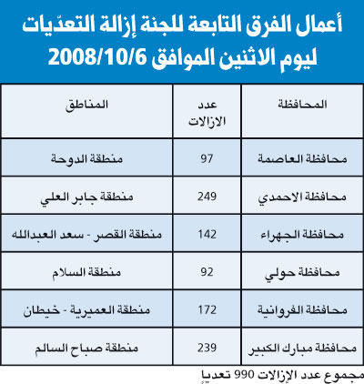 حوليبدوره، قال رئيس الإزالة بمحافظة حولي طارق القطان إن عدد الإزالات، التي تم رفعها، بلغ 92 تعديا على أملاك الدولة، وتشمل أسوارا خارجية، وتعديا على ممرات المشاة، ورفع الأشجار التي تحجب الرؤية، إذ إنها تؤدي الى كثرة الحوادث المرورية. وتمنى القطان من الاخوة المواطنين أن يطبقوا القوانين الموضوعة من قبل مجلس الوزراء بشأن التعديات على أملاك الدولة. مبارك الكبيرأكد رئيس فريق لجنة الإزالات بمحافظة مبارك الكبير مشعل الصافي، أن الجرافات أزالت 239 تعديا في منطقة صباح السالم، وشكر الصافي المواطنين على تعاونهم مع أعضاء اللجنة ومساعدتهم لهم.فريق العملمن جهته، قال رئيس فريق العمل محمد دشتي انه تم رفع 11 تعديا في منطقة بيان، كان منها المظلات الملاصقة للمحولات الكهربائية، التي تشكل عائقا أمام فرق وزارة الكهرباء والماء، إذ اوصى بإزالتها جهاز البلدية بعد الحرائق المتكررة في الفترة الأخيرة، والتي كان منها وأخطرها حريق المحول الكهربائي في منطقة جليب الشيوخ.