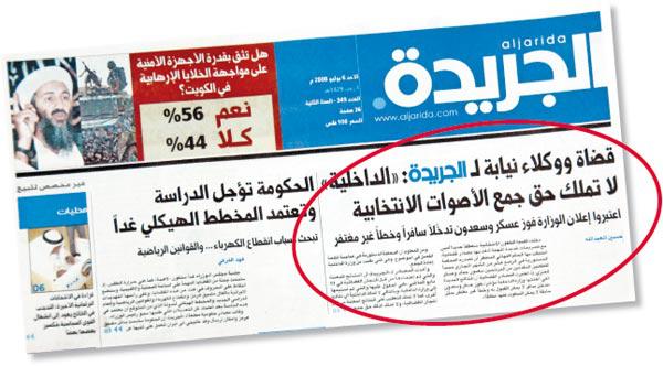 الدستورية تنظر طعنَي عسكر وسعدون 20 الجاري مع طعون الأولى والثالثة دفاعا الوعلان ومهدي يستشهدان بحديث القضاة لـ الجريدة واعتراف الداخلية بالنتائج المعلنة سعدون يؤكد حصوله مجدداً على الثامن... ودفاع مهدي العجمي يطالب برفض الطعن... وعسكر يؤكد: طعني ليس موجهاً ضد شخص!