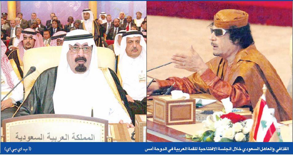 خطف الزعيم الليبي معمر القذافي الأضواء مرة جديدة في القمة العربية، عندما توجه الى العاهل السعودي برسالة مزج فيها التهجم وطلب المصالحة. والقذافي الذي غالبا ما شغل صحافيي القمم العربية بخطواته وتصريحاته المثيرة للجدل، قاطع أمير قطر بعيد القائه كلمته الافتتاحية، ليتوجه الى الملك عبدالله بن عبدالعزيز مؤكدا انتهاء الاشكال بينهما، وانما بعد توجيه انتقادات لاذعة إليه.ودعا القذافي الملك عبدالله الى تبادل الزيارات بينهما بعد سنوات من الخصومة. وقال القذافي مقاطعاً أمير قطر: «الى أخي عبدالله، 6 سنوات وانت هارب وخائف من المواجهة». وأضاف متوجها الى العاهل السعودي: «اريد أن اطمئنك بألا تخاف، وأقول لك بعد ست سنوات ثبت انك انت الذي الكذب وراءك والقبر امامك، وانت هو الذي صنعتك بريطانيا وحمتك اميركا». وتابع «احتراما للامة، اعتبر المشكل الشخصي الذي بيني وبينك قد انتهى وانا مستعد لزيارتك وتزورني انت».