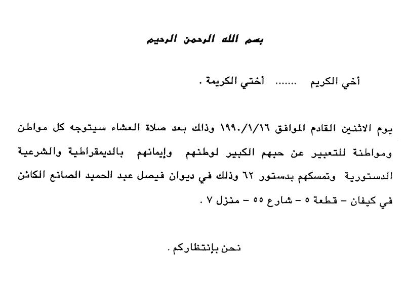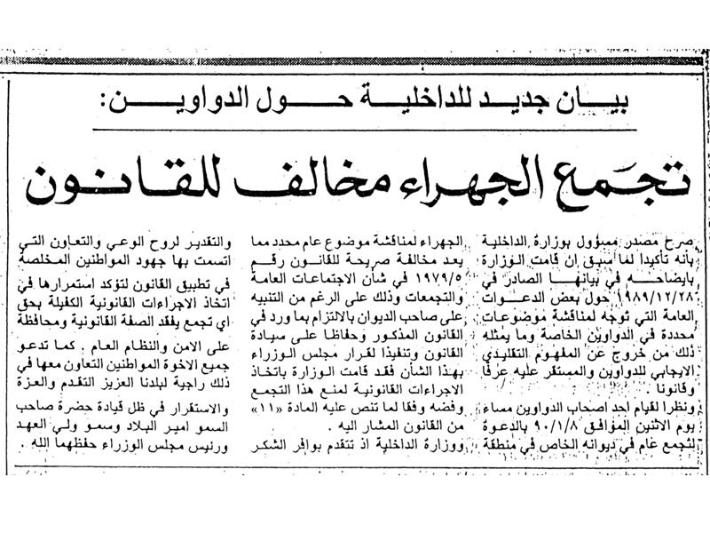 وبما أننا نعيش هذه الأيام في أجواء تأزيمية وحالة احتقان سياسي ملحوظ، وتتردد أقاويل هنا وهناك عن أن النية قد تتجه إلى انقلاب ثالث على الدستور، فإنه من الضرورة بمكان التذكير بما جرى في البلاد آنذاك عسى أن تنفع الذكرى. على مدى هذه الحلقات تروي «الجريدة» قصة التحرك الشعبي بين عامي 1986 و1990.كانت «موقعة الجهراء»، إن جاز التعبير، مؤشراً واضحاً على أن التصعيد أصبح هو النهج الذي قررت السلطة انتهاجه فتوارى صوت العقل والتهدئة والحوار، فكانت تلك الأحداث بمنزلة الصدمة للمواطنين فشكلت حدثاً لم يكن مألوفاً للكويتيين وتحولاً واضحاً في تعاطي السلطة مع الحركة الشعبية المطالبة بعودة العمل بالدستور، وقد كانت عملية الضرب التي تعرض لها المواطنون في ذلك اليوم رسالة واضحة من السلطة بعدم سماحها لاستمرار هذه التحركات، إلا ما كان واضحاً في الجانب الآخر من الصراع لعودة الدستور هو إصرار «الحركة الدستورية» على مواصلة عملها السلمي، فأرسل تكتل النواب برقية إلى ولي العهد ورئيس مجلس الوزراء الشيخ سعد العبدالله مستنكرين فيها الاعتداء على المواطنين ومؤكدين مواصلتهم عقد لقاءات الدواوين، في ما بدا تحدياً للسلطة وإصرارا على المطالبة بعودة العمل بالدستور.برقياتكما نتج عن أحداث الجهراء سيل كبير من برقيات الاستنكار والاحتجاج الموجهة إلى سمو أمير البلاد الشيخ جابر الأحمد وإلى ولي العهد، فبالإضافة إلى برقية النواب التي أشرنا إليها، أرسلت مجموعة الـ 45 والعديد من جمعيات النفع العام برقيات مماثلة، إلا أن البارز من بين هذه البرقيات هي برقية استنكارية أرسلها المواطن محمد المرزوق إلى وزير الداخلية آنذاك الشيخ سالم الصباح إذ اختلفت عن غيرها من البرقيات فذيلها المرزوق بتوقيعه واسمه وعنوانه وقد انتشرت البرقية في دواوين الكويت وتم ترديدها وقراءتها في العديد من اللقاءات الشعبية اللاحقة إذ شكلت نموذجاً لتفاعل المواطنين مع الحركة الشعبية. وبالإضافة إلى برقية المرزوق فقد تم تداول برقية أرسلتها ابنة النائب السابق محمد الرشيد الذي تعرض للضرب في ذلك اليوم، وقد أرسلتها ابنته لولوة إلى أمير البلاد تطلب منه العودة للعمل بالدستور. وإضافة لما سبق فقد كان لأحداث الجهراء أصداء واسعة في الإعلام العربي والأجنبي، فقامت الحركة الدستورية بجمع ما تيسر لها عما نشر في الإعلام الخارجي وتوزيعه على المواطنين.لاعودةوعلى الجانب الحكومي، أصدرت وزارة الداخلية بياناً بعد الأحداث، نشرته الصحف المحلية، أكدت فيه أن تجمع الجهراء جاء مخالفاً للقانون، في حين أدلى وزير الإعلام آنذاك الشيخ جابر المبارك بتصريح صحافي لوكالة أنباء رويترز منعت الصحافة المحلية من نشره أكد فيه «ان المجلس القديم لن يعود، فلا يمكننا العودة إلى شيء فشل»، مبيناً أن مجلس الأمة المعطل خلق توترات بين الجماعات العرقية في الكويت، وعزز المشاعر القبلية، وأثار مشاكل مع الدول المجاورة، وكان يجري استغلاله لخدمة أغراض شخصية. وأشار المبارك في التصريح ذاته «ربما يكون بوسعنا التوصل إلى شيء أكثر ملاءمة لطبيعة بلادنا، وإذا كان هناك مفهوم جديد فليس لدينا مانع»، مؤكداً في الوقت ذاته إطلاق قوات الأمن قنبلتين صوتيتين في تجمع الجهراء، مبيناً أن الشرطة لم تلجأ إلى ذلك إلا بعد أن حاولت الحشود اقتحام نطاق أمني فرضته الشرطة حول الديوانية، نافياً وجود أي معلومات لديه بضرب أي من المتظاهرين، مبيناً أنهم لا يمثلون سوى أقلية ضئيلة من الرأي العام الكويتي، قائلاً إنه لم يكن هناك أكثر من 1000 شخص وأن نصفهم كانوا من المارة الذين وقفوا لمشاهدة ما يجري.اعتقالفي غضون ذلك، وفي تمام الساعة الثالثة والربع من يوم الأربعاء 10 يناير، أي بعد تجمع الجهراء بيومين، رن هاتف سيارة رئيس مجلس الأمة أحمد السعدون وكان الاتصال من النائب أحمد الشريعان يقول فيه: «جوني اثنين من الشرطة إلى البيت وطلبوا مني الحضور لمخفر الفيحاء وقالوا لي ان الموضوع بسيط، وأنا الآن مع السائق في سيارتي الآن متوجه للمخفر