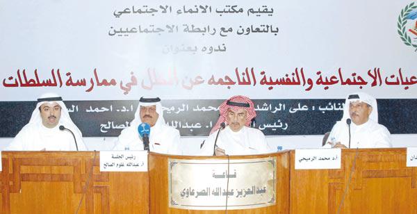 وقال الراشد في ندوة التداعيات الاجتماعية والنفسية الناجمة عن الخلل في ممارسات السلطات الدستورية، التي نظمها مكتب الإنماء الاجتماعي بالتعاون مع رابطة الاجتماعيين الليلة قبل الماضية، ان الحكومة دائما تضع المجلس كشمّاعة تعلّق عليها قصورها، متسائلا: من المسؤول عن تعطيل بناء الجامعات والمدارس والمستشفيات وغيرها؟ وأضاف أن المجلس يقف امام أي مشروع تشوبه شبهات الأمر الذي يكون مادة كي تشن الحكومة هجومها على المجلس وتدّعي أنه يعطل التنمية. أصوات عاليةوقال الراشد إنه من الطبيعي ان تكون هناك أصوات عالية وأخرى خافتة، فلكل شخص أسلوبه في ايصال ما يريد، لافتا إلى أن الصحافة أصبحت تتداول تصريحات النواب على انها قضية. وأكد أنه لا يبرئ المجلس وليس في موضع المدافع عن مواقف المجلس، مشددا على ضرورة انشاء الأحزاب نظرا إلى الحاجة الماسة لانقاذ البلد. وأوضح الراشد اننا لم نستفِد من الطفرة المالية خلال السنوات الماضية، والآن نمر بمرحلة ركود، معتبرا ان مطالبة البعض باسقاط الديون غير ملامين عليها، لأنهم لا يرون اي مشروعات تنموية، لافتا إلى ان الوضع لا يدعو الى التفاؤل. وأشار الى المطالبة بحل المجلس، وقال انها غير مجدية ولم نستفِد من سابقاتها، خصوصا انها باتت مكلفة ماديا، مؤكدا ان الذي لديه نوايا سيئة سيجد من يدعمه ويخوض التجربة مرة اخرى، في حين ان الذي لديه نوايا طيبة قد لا يخوضها مرة أخرى، وبالتالي سنجد أنفسنا نوصل الاشخاص السيئين ونحصل على مجلس أسوأ من سابقه. تأزيم نفسي وأضاف اننا نعيش في مرض بين السلطتين، مشيرا الى اننا يجب أن نتحمل السلبيات والايجابيات، وقال اننا وصلنا إلى مرحلة تأزيم نفسي لدى الناس نتيجة الصراع بين السلطتين، وأصبح الحديث السياسي هو حديث كل بيت، مشيرا إلى ان الصحافة لها دور كبير في هذا الوضع. من جانبه قال د. محمد الرميحي، إنه خرج بانطباع من خلال حديث النائب علي الراشد، وهو أن هناك اعترافا بالتأزيم، لافتا إلى انه يجب ألا نلقي اللوم على الصحافة لانها ناقلة للخبر وليست مصدره. واضاف ان هناك 3 موضوعات رئيسية يجب التطرق إليها، وهي الوضع الاقليمي المحيط بالكويت ثم فهمنا للديمقراطية في الكويت ثم القضايا الرئيسية التي تكون تحت سقف السياسيين. وأوضح ان الوضع الاقليمي المحيط بالكويت قد يتحول إلى حرب والاوضاع الساخنة حولنا تدل على ذلك، فهناك حرب أهلية في العراق وحرب قد تكون بين ايران واميركا، اضافة إلى الازمة الاقتصادية العالمية التي تأثرنا بها، واشار إلى ان اسعار النفط والتذبذب سيفاقمان المشكلات خصوصا بعد تراجع الوضع الاقتصادي، مؤكدا ان الوضع الاقليمي مقلق. محاربة الإرهابوبين ان محصلة تلك الاحداث، هي ان اميركا لن تستمر في الدفع من اجل الديمقراطية وستجنح إلى تحسين الاقتصاد، وكذلك ستنحصر محاربة الارهاب عند بعض الأنظمة. وقال الرميحي: أما فيما يخص فهمنا للديمقراطية في الكويت، فإن لها نوعين من الأذرع، وفي حال عمل احدهما ضد الآخر فانها ستكون قاتلة للديمقراطية، مشيرا إلى ان هناك محاولة لفصل الحريات عن الآليات. وأضاف ان الحريات هي حرية القول وحرية العبادة وحرية التخلص من العوَز وحرية التخلص من الخوف. مؤكدا اننا يمكننا حل كل المشكلات عن طريق الطرح العقلاني عبر المؤسسة الديمقراطية، مشيرا إلى ان الحريات تراجعت كثيرا. وقال ان الديمقراطية هي الحل الاسلم لكل المشكلات، غير أنها عبارة عن منظومة، مؤكدا انه لا يجب ان يصل أناس عبرها «ويفرضوا عليّ آراءهم». وبيّن الرميحي ان المشكلة الرئيسية في محتوى التعليم، وأن ما يدور من استجوابات هو لعدم تعيين وكلاء ومناصب قيادية في الوزارة، وليس لها علاقة بالمحتوى. واضاف ان لدينا اسوأ انواع الأحزاب فهناك جماعات تُستشار في تشكيل بعض الوزراء، متسائلا: هل نبقي على دستور سُنَّ منذ خمسين عاما وهو نص انساني وليس مقدسا؟ مؤكدا ان موضوع الدستور الكويتي يجب اعادة النظر فيه، فهل عدد السكان بقي كما كان ليبقى عدد اعضاء مجلس الامة كما كان؟ من ناحيته ا