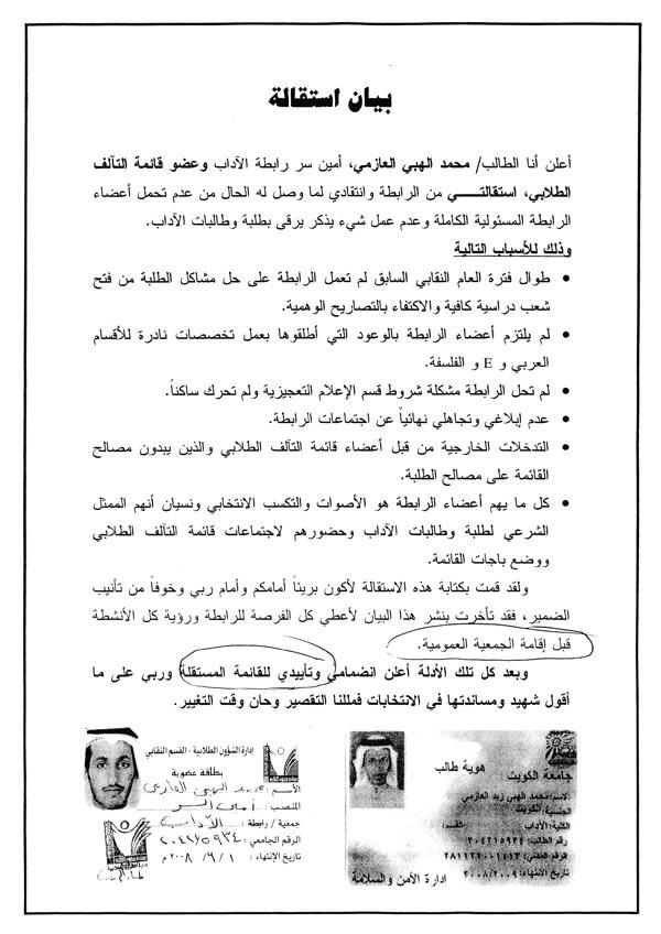 قدم أمين سر رابطة الآداب محمد العازمي استقالته من رابطة الكلية وانشق عن قائمة التآلف الطلابي معلنا انضمامه إلى القائمة المستقلة.تقدم أمين سر رابطة طلبة كلية الآداب في جامعة الكويت وعضو قائمة التآلف الطلابي بجامعة الكويت محمد العازمي ببيان استقالته من رابطة الآداب وقائمة التآلف الطلابي بما يعد انشقاقا رسميا، ووزعه في ارجاء كلية الآداب بكيفان.