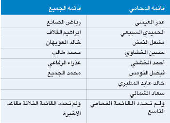 اعتمادومع اعتماد القوائم المتنافسة على مقاعد جمعية المحامين للأسماء المتوقع تمثيلها، فقد أعلن عدد من المحامين نيتهم خوض الانتخابات بشكل مستقل، بينما طعمت القوائم المتنافسة «المحامي» و«الجميع» قائمة الأسماء ببعض الأسماء الجديدة اللافتة، كاختيار قائمة المحامي فيصل النومس، الذي يتمتع بشعبية كبيرة بين المحامين خصوصا من أوساط جيله، في حين اختارت قائمة الجميع المحامي محمد أحمد طالب، وهو أيضاً يتمتع بشعبية كبيرة بين صفوف المحامين، لاسيما بين المحامين الحاصلين على شهادات الحقوق من الجامعات المصرية، لكون المحامي طالب كان أحد الفاعلين في الاتحاد الكويتي للطلبة، فضلا عن نجاحه في إدارة لجنة أدعياء المهنة، وحصول جمعية المحامين لأول مرة في تاريخها على حكمين جنائيين ضد أشخاص غير منتمين إلى المهنة ويدعون بعملهم في المحاماة.اقترابومع اقتراب موعد انتخابات جمعية المحامين فقد حسمت القوائم أغلبية الأسماء المتوقع خوضها وحددت قائمة المحامي منصب الرئيس لعمر العيسى، ونائب الرئيس للمحامي الحميدي السبيعي، وأمانة السر قد تكون لصالح مشعل النمش، علاوة على اختيار حسين الخشاوي وفيصل النومس وخالد عايد المطيري ودخول المحامية سعاد الشمالي، وكانت أبرز الأسماء المغادرة للقائمة من المحامين عبداللطيف صادق رئيس الجمعية، التي تؤكد مصادر قريبة منه رغبته في الاستمرار، وان البعض فضل التغيير في الرئاسة، علاوة على مغادرة كل من عبدالرحمن البراك وأسمى العوضي وفاضل الجميلي.اوساط بينما حددت قائمة الجميع التي يترأسها المحامي رياض الصانع ستة أسماء حتى الآن؛ الاول رياض الصانع، وإبراهيم القلاف، وعذراء الرفاعي، وخالد العويهان، ومحمد الجميع، ومحمد أحمد طالب، ولم تحدد القائمة بعد باقي الأسماء، لكن بعض المصادر تشير إلى قوة بعضها، والتي تحظى بها القائمة كالمحامين خالد العويهان ومحمد الجميع ومحمد أحمد طالب، كما تتوقع أوساط المحامين خوض كل من المحامين خليل القطان ومفرح المطيري الانتخابات مستقلين، على الرغم من وجود محاولات لانضمامهم مع إحدى القوائم المتنافسة، لكن المحاولات لم تضف شيئا جديدا.موعدوعن موعد انتخابات جمعية المحامين الكويتية يقول رئيس الجمعية المحامي عبداللطيف صادق، ان مجلس إدارة الجمعية سيجتمع الأسبوع الجاري وسيعلن موعد إجراء الانتخابات المقبلة، وان مجلس الإدارة سيقدم التقريرين الإداري والمالي في موعدهما، لافتا إلى عدم صحة المعلومات التي تحدثت عن وجود مصروفات بقيمة 500 ألف دينار كويتي من دون فواتير، وان التقرير المالي سيكشف لكل محامي المصروفات والفواتير الدالة عليها.خلافوعن حل قائمة المحامي لخلاف المحامي عمر العيسى مع المحامي خالد الكندري بشأن منصب الرئاسة قال صادق، ان «الأمور في طريقها إلى الحل، وإن شاء الله ستحل، والأيام المقبلة سوف تؤكد ذلك، ولكن منصب الرئاسة حسم للأخ عمر العيسى».اليةأما عن آلية حل الخلاف بين المحامين الكندري والعيسى فقال صادق «لا يمكن الحديث عن كيفية الحل، ولكن الأمور في طريقها إليه»، مضيفا في رده على تساؤل بشأن وجود نية لدى الكندري خوض الانتخابات بقائمة ثالثة قائلا: «هذا الخيار مستبعد حتى الآن، ولكن سنسعى إلى حل الخلاف والخلاف وارد بين الاخوة وهو أمر طبيعي».