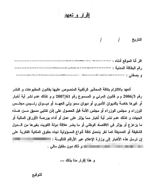 «أتعهد... التزم... محاذير رقابية... عدم نشر أي أخبار... اذن كتابي مسبق»، مصطلحات تذكرنا برقباء وزارة الاعلام ابان فترة الحل غير الدستوري على الصحافة عام 86، حين كانت الاعلام تحدد بمزاجية للصحافة ما ينشر، ولنا ما نقرأ.تلك الأجواء حنت اليها «الإعلام» بعد ان فقدت السيطرة على رقابة القنوات الفضائية وما ينشر على شبكة الانترنت من مواد مرئية ومسموعة ومقروءة، فأعدت قانون المطبوعات الجديد، ولاحقا قانون المرئي والمسموع، وتعد لقانون رقابة الانترنت، لتنتهي بالأمس بتوقيع الشركات التي تقدم الخدمات الإخبارية عبر الرسائل القصيرة SMS لاقرار وتعهد بـ «عدم نشر أي أخبار أو غيرها خاصة بالديوان الأميري أو ديوان سمو ولي العهد أو ديوان رئيس مجلس الوزراء ومجلس الوزراء أو مجلس الأمة قبل الحصول على إذن كتابي مسبق من هذه الجهات!». وينتهي الاقرار والتعهد «على أن ترسل هذه الأخبار الى وزارة الإعلام عبر الأرقام التالية... وذلك دون مقابل مالي!!»، وكان الأسهل على «الإعلام» أن توقف تلك المصادر الإخبارية على سجنها بهذا التعهد والاقرار.