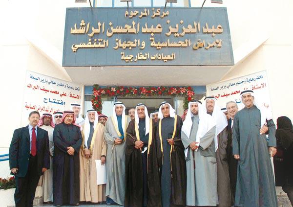 افتتح وزير الصحة علي البراك أمس المبنى الجديد للعيادات الخارجية في مركز عبدالعزيز الراشد لأمراض الحساسية والجهاز التنفسي، والذي يتكون من 3 طوابق ويحتوي على 16 عيادة خارجية.أكد وزير الصحة علي البراك أن تطوير الرعاية الصحية يحتاج الى تعاون وتضافر الجهود بين وزارة الصحة والمجتمع، مشيراً إلى أن مشروع مركز الراشد لأمراض الحساسية يجسد هذا التعاون باعتباره يمثل السبق الاول في هذا العطاء، لافتا إلى ان المركز اقيم في عام 1984 بتبرع كريم من المرحوم عبدالعزيز عبدالمحسن الراشد.