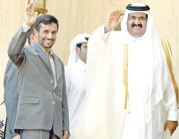 أجرى أمير قطر الشيخ حمد بن خليفة آل ثاني محادثات مع الرئيس الإيراني محمود أحمدي نجاد في طهران أمس، تناولت العلاقات الثنائية وآخر التطورات الإقليمية، وأكدا خلالها «ضرورة تكثيف المشاورات وتعزيز التعاون الثنائي، لضمان السلام والاستقرار في المنطقة وإحباط مؤامرات الأعداء». ووصف أمير قطر العلاقات بين البلدين بأنها «ودية ومتنامية وراسخة».