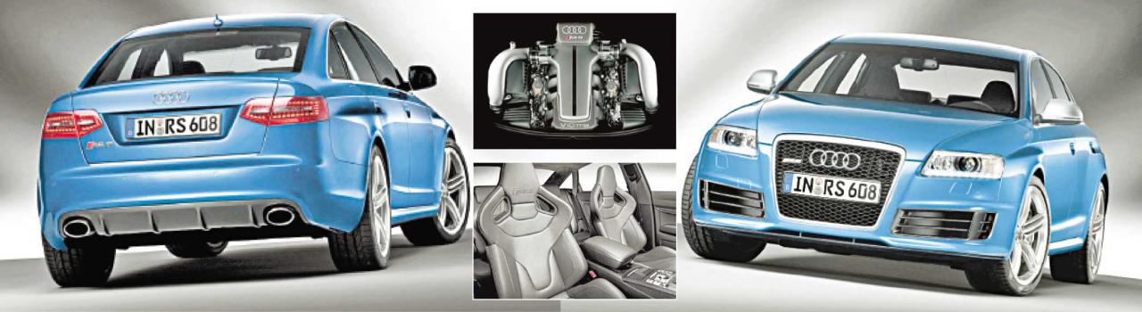 التصميم ومقصورة الركابيقتضي حجم وسعة المحرك عالي الأداء V 10 والمزود بشحن توربيني مزدوج الحاجة إلى كميات كبيرة من الهواء لتعزيز الاستجابة ، وتم مراعاة هذه الضرورة من خلال توسيع ممرات الهواء لدى المقدمة. كما تمت إعادة تصميم الفسحة الأمامية الفاصلة بين المحرك وبين الشبك الواقي للرادياتير المصنوع من قطعة واحدة والذي يحمل شعار RS 6 باللونين الأحمر والفضي، إضافة إلى المصابيح الأمامية التي جرى تعزيزها بشرائح إنارة متوهجة تعمل خلال اليوم يحوي كل منها 10 صمامات ثنائية الإضاءة (LEDs). وتعتبر الزوائد الجانبية Trims وحواجز الإطارات Fenders المنسابة إلى الخلف، من مميزات المظهر الجانبي للسيارة. وتم صنع حواجز الإطارات الأمامية وغطاء المحرك من الألمنيوم، وتعيد هذه الحواجز الذي تأخذ نهاياتها شكل الزاويا إلى الأذهان، حواجز سيارات Audi quattro (ur-quattro)، التي شكل استخدامها منعطفاً تاريخياً في صناعة السيارات منذ ظهورها للمرة الأولى في العام 1980. وتترك الجهة الخلفية للسيارة انطباعاً رائعا، بفضل تجهيزها بموزع هواء سفلي عريض وأنبوبي العادم الكبيرين وجناح ينظم حركة الهواء عبر هيكل السيارة ومصابيح متوهجة تشمل تقنية (LEDs). وتم إضفاء بعض اللمعان على صبغ سيارة RS 6، فيما تعتبر السيارة الوحيدة التي تتوفر منها موديلات بلون أزرق Sepang، حيث تنفرد بهذه الميزة عن جميع السيارات الأخرى.