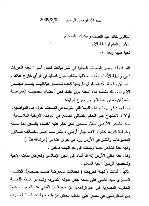 وفي ما يلي نص الخطاب:الدكتور خالد عبداللطيف رمضان المحترم...الأمين العام لرابطة الأدباءتحية طيبة وبعد...فلقد فاجأتنا بعض الصحف المحلية بنشر بيانات تحمل اسم «لجنة الحريات» في رابطة الأدباء، أبدت خلالها مطالب حول قضايا في الرأي خارج البلاد، علما أن رابطة الأدباء طوال تاريخها كانت تصدر بياناتها باسم مجلس الإدارة... ولقد نشأت هذه اللجنة دون علمنا نحن أعضاء الجمعية العمومية، وعلمنا أن بعض أعضائها من خارج الرابطة.ومما ورد في بيانات هذه اللجنة التي نشرت في الصحف حول هذه المواضيع:أولا: الاحتجاج على الحكم القضائي الصادر في المملكة الأردنية الهاشمية، ضد الشاعر الأردني اسلام سمحان الذي حكم عليه القضاء بالسجن مدة سنة وغرامة قدرها عشرة آلاف دينار أردني، لنشر ما هو مخالف لقانون المطبوعات والنشر في الأردن، مما ورد في ديوان الشاعر «برشاقة ظل». واجه هذا الشاعر حملة وصلت إلى حد اتهامه بالكفر، وقال عنه مفتي الأردن إنه قد أساء إلى الدين الإسلامي وتعرض للذات الإلهية وشخصية الرسول عليه الصلاة والسلام.ثانياً: أدانت «لجنة الحريات» الحملات المعارضة ضد حصول الكاتب المصري سيد القمني على منحة جائزة الدولة التقديرية، وتدعو هذه اللجنة الحكومة المصرية إلى عدم تراجعها عن منح السيد القمني هذه الجائزة، علما بأن المعترضين في مصر على الكاتب بسبب بعض مؤلفاته، ومنها كتاب «الحزب الهاشمي» الذي يدّعى فيه الكاتب أن الدين الإسلامي مشروع طائفي جاء به عبدالمطلب وفق الديانة اليهودية. رغم ذلك فإن «لجنة الحريات» ليس من شأنها أن تخاطب الحكومات على موافقتها، سواء أبقت على الجائزة التقديرية او سحبتها.ثالثا: البيان الثالث الذي احتجت فيه اللجنة على موقف الحكومة الإيرانية تجاه اعتقال بعض الكتاب والمثقفين ومنعهم من حرية التعبير. رابعا: اعترضت «لجنة الحريات» على منع المملكة العربية السعودية رواية «سور جدة» للروائي السعودي سعيد الوهابي، والرواية فيها مساس بالثوابت والهوية الوطنية، وتدخّل في شأن سعودي. لذا فإننا نحن الموقعين أدناه في رابطة الأدباء نعبر عن استيائنا لتصرف «لجنة الحريات» ونشأتها دون علمنا، وتدخلها في قرارات وأحكام قضائية وإجراءات داخلية لدول عديدة، ونأمل اعادة النظر في تشكيل هذه اللجنة، وألا تصدر أية بيانات تحمل اسم الرابطة، وألا يُعتمد إلا ما هو بتوقيع الأمين العام الذي يمثل جميع اعضاء الجمعية العمومية ومجلس الإدارة.الموقعون:أ – عبدالله خلفأ – حمد الحمدد. خالد الشايجيآراء البغداديوفي اتصال مع «الجريدة» أوضح الأمين العام الأسبق للرابطة عبدالله خلف أن الكتاب الذي وُجه إلى مجلس إدارة رابطة الأدباء، ويتضمن احتجاجاً على آلية عمل «لجنة الحريات» إنما تم بالاتفاق مع كثير من الأدباء داخل أسوار الرابطة، ولو أردنا اللجوء إلى جمع تواقيع لظهر للناس العدد الحقيقي للأدباء الرافضين لهذه اللجنة، ولكننا لم نشأ ذلك حتى لا يظهر الأمر كأنه انقسام داخل الرابطة، أو صراع بين الأدباء.واستطرد خلف موضحاً أن «لجنة الحريات» خاضعة لأفكار الدكتور أحمد البغدادي الذي عُرف بآرائه المعادية للدين، وسُجن بسببها، وأينما حل فإنه (البغدادي) يُحدث زوبعة من دون فائدة علمية أو فكرية حقيقية، يحدث ذلك على الرغم من أنه ليس عضواً في «رابطة الأدباء».وأكد خلف أن المؤسسات الثقافية في الكويت تنأى بنفسها عن الخلافات ذات الطابع العقائدي، كما أنها لا تصطدم مع دول أخرى لها مؤسساتها الداخلية وقضاؤها المستقل.ولم يخلُ حديث خلف من عتاب موجه إلى جيل الشباب، وقال: «من غير اللائق أن يُطلقوا علينا لقب «الحرس القديم» ونحن الذين انتخبناهم وأفسحنا لهم المجال لتطوير العمل الثقافي، ولو لم نكن معنيين بالثقافة لما حدث ذلك».واختتم خلف حديثه موضحاً أن بعض بيانات لجنة الحريات صدرت من دون علم الأمين العام خالد رمضان ذاته لأنه كان مسافراً خارج البلاد.يشار إلى أن الأديبة ليلى العثمان كانت قد أشارت في حديث صحافي سابق إلى أنها لم تطلع على بعض بيا