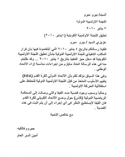 وجه الاتحاد الدولي لكرة القدم (الفيفا) صفعة قوية إلى مدير العلاقات الدولية باللجنة الأولمبية الدولية بيرو ميرو، حينما أكد "الفيفا" رفضه كتاب "الاولمبية الدولية" الممهور بتوقيع ميرو، والذي يطالب "الفيفا" فيه بتعليق نشاط الاتحاد الكويتي لكرة القدم، إذ أكد "الفيفا" في رده أنه لا يمكن النظر في شأن الاتحاد الكويتي إلا بعد أن تنظر المحكمة الرياضية الدولية في الشكوى المرفوعة من قبل 10 أندية كويتية والتي تختصم فيها "الفيفا".