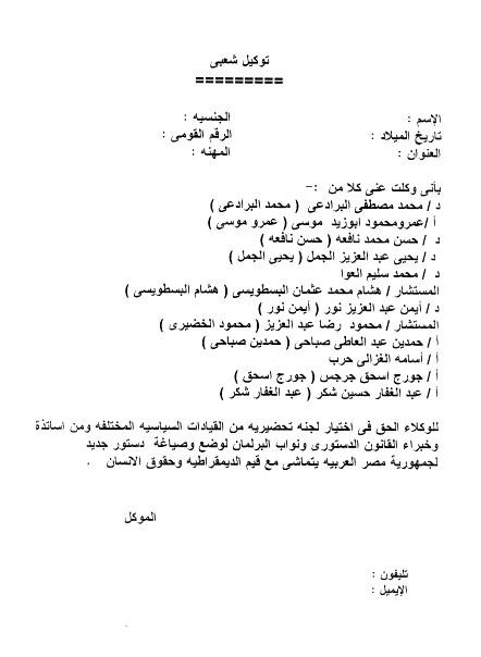 "عايز حقي"وأعلن مؤسس مجموعة "عايز حقي" صفوان محمد تطويرَ فكرة التوكيلات الشعبية للمدير السابق للوكالة الذرية محمد البرادعي إلى توكيل شعبي عام لمجموعة من السياسيين لتعديل الدستور كلجنة موحدة لتجنب الخلاف بين الحركات الشعبية المختلفة، وتوحيد مختلف القوى السياسية المعارضة. "لائحة الـ 12" وتم تشكيل لائحة من 12 سياسيا مصريا، وللموكل حق اختيار من يرشحه، وتضم اللائحة الى جانب البرادعي الأمين العام لجامعة الدول العربية عمرو موسى، ومؤسس حزب "الغد" أيمن نور، وحسن نافعة، ويحيى الجمل، ومحمد سليم العوا، والمستشار هشام البسطويسي، والمستشار محمود الخضيري، والنائب حمدين صباحي، وأسامة الغزالي حرب، وجورج إسحاق، وعبد الغفار حسين شكر.الخضيريوعبّر المنسق العام لحركة "مصريون من أجل انتخابات حرة ونزيهة" المستشار محمود الخضيري عن موافقته على فكرة "لجنة الـ12"، مؤكداً أن "الهدف الذي تسعى إليه مختلف الحركات المعارضة واحد"، ومطالباً بـ"جمع كل أطياف المعارضة في نسق واحد منعا للانقسام والضياع في تفاصيل لن تصل إلى شيء"، وأشار إلى أن "العيب الرئيسي في الحركات الشعبية حاليا هو تمزقها"، داعيا إلى أن تكون لجنة 12 وسيلة لتطوير العمل السياسي في مصر. أيمن نورودعا أيمن نور جميع أنصاره لاستخراج توكيلات مجمعة لـ"لجنة الـ12" للابتعاد عن فكرة تفتيت التوكيلات بين عدد من الشخصيات، مؤكداً أن "جميع الأسماء المطروحة وافقت على الفكرة باستثناء البسطويسي والبرادعي وموسى"، مضيفا أن اللجنة التحضيرية لها أن تختار من تشاء للجنة التأسيسية من أساتذة القانون والخبراء لوضع الدستور الجديد.