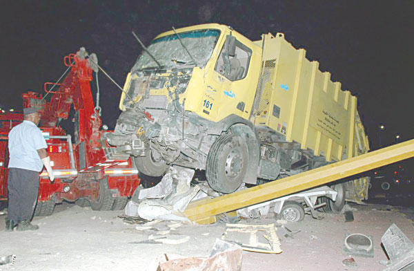 في حادث مروع لقي مصري حتفه في منطقة صبحان مساء امس الاول، حين كان متوجها الى منزله وعند الإشارة الضوئية غير رأيه وحاول الانحراف بسيارته الى الطريق الفرعي من دون أن ينتبه إلى الطريق، ولما انحرف فوجئ بشاحنة قمامة تسير باتجاهه لتصطدم بسيارته من الجنب وتدفعها حتى الاشارة المرورية، لتصعد الشاحنة فوقها والمصري داخلها، وظل الامر على هذه الحال حتى وصلت فرقة الاطفاء بعد بلاغ أمني ورد الى غرفة عمليات وزارة الداخلية.