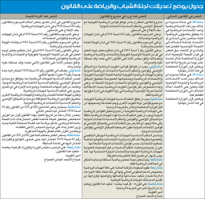 جدول يوضح تعديلات لجنة الشباب والرياضة على القانون نشر في 31-12-2009 | 00:00 آخر تحديث 31-12-2009 | 00:00
