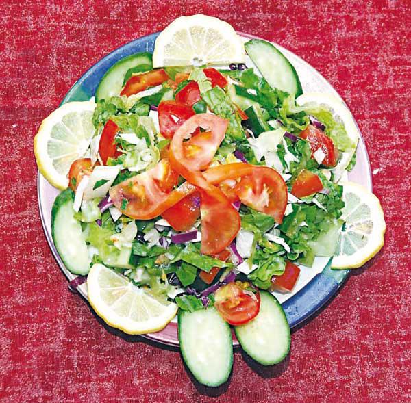 - 500 غرام طماطم.- 500 غرام خيار.- 200 غرام فجل.- 200 غرام بربير(بقلة).- 100 غرام بقدونس ورق.- 100 غرام نعناع. - 30 غراماً من السماق.- 10 غرامات ملح.- 200 غرام زيت زيتون.- 100 غرام عصير الحامض.الطريقة - قطّعي أوراق الملفوف والخس والفليفلة الخضراء والحمراء والصفراء الى شرائح طويلة.- قطّعي الخيار والبصل.- ضعي الفليفلة الخضراء والحمراء والصفراء والبندورة الصغيرة في وعاء وتبّليها مع عصير الليمون والملح والفلفل وأضيفي زيت الزيتون والخلّ وامزجيها جيداً، ثم اضيفي أوراق الملفوف والخس والخيار والبصل.