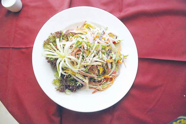 - 50 غ بصل أحمر.- 75 غ طماطم.- 75 غ خس أخضر. - 50 غ بقدونس أخضر ورق.- شرائح من الديك الرومي المدخّن.- 50 غ جبنة.الطريقة:أفرمي الخضار بشكل طولي وكذلك الديك الرومي والجبنة. تبّليها بصلصة دريسينغ، وزيّنيها كما في الصورة ثم قدّميها.