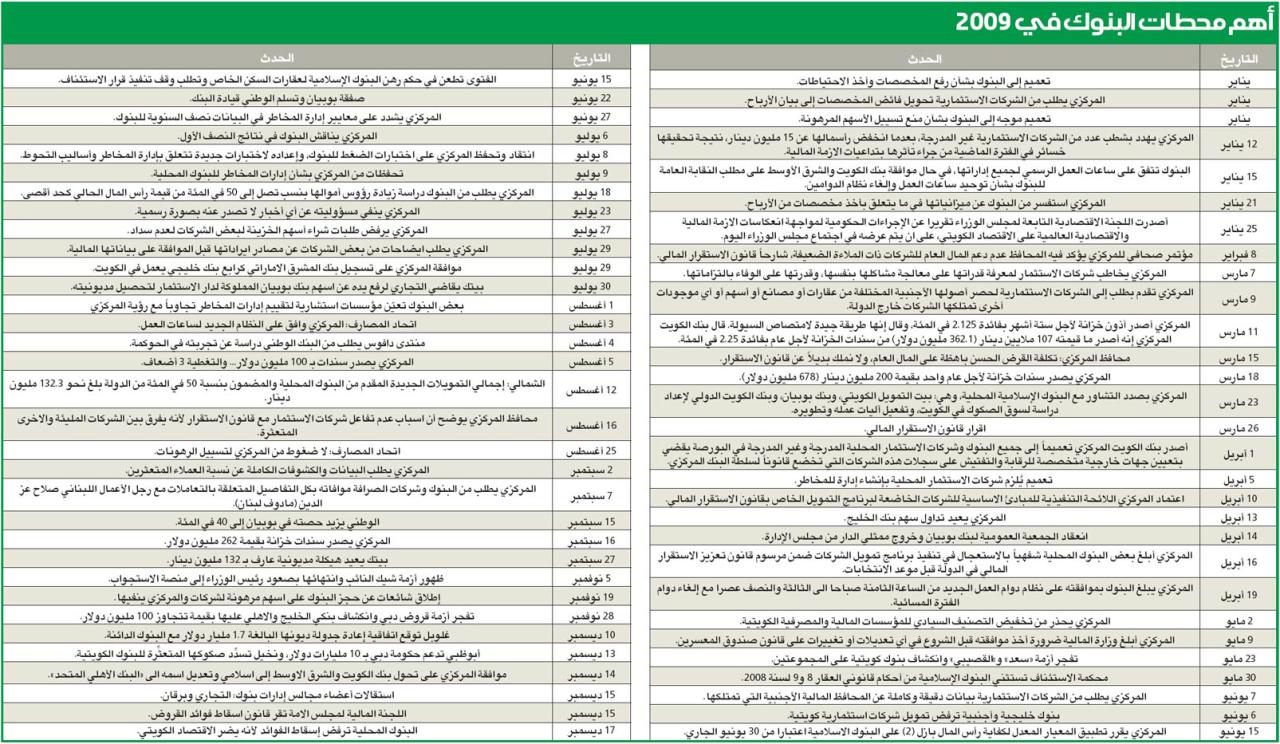 «الجريدة» أعدت إحصائية لأهم المحطات والأحداث التي مرت بها البنوك الكويتية من بداية العام حتى الآن، والتي بلغت 62 حدثا تنوعت بين تعميمات للبنك المركزي وأحداث محلية وعالمية أثرت في أداء البنوك خلال هذا العام، بعضها كان ايجابيا وأغلبها سلبي، أدت إلى تباطؤ بعض العوامل الاخرى التي عززت من معدلات نمو البنوك في السابق، أهمها ركود سوق العقار وتذبذب اسعار النفط وانخفاض معدلات الائتمان، وهبوط اسعار الاصول، وقد أدى انكماش السوق إلى تزايد المنافسة بين البنوك التسعة المحلية بجانب البنوك الاجنبية العاملة في الكويت.تراجع الأرباح وزيادة المخصصاتتراجعت أرباح البنوك التسعة بشكل ملحوظ في الأشهر التسعة الاولى بقيمة 533.9 مليون دينار وبنسبة 59.6 في المئة لتبلغ 360.8 مليون دينار مقارنة بـ 894.76 مليون دينار في نفس الفترة العام الماضي، ويرجع هذا الانخفاض الكبير في أرباح البنوك إلى المخصصات التي اتخذتها البنوك منذ بداية العام، والتي تجاوزت المليار دينار: 460 مليون دينار لـ»بيتك»، 229.6 مليون دينار لـ»التجاري»، 100.6 مليون دينار لـ«الخليج»، 93 مليون دينار لـ«برقان»، 35 مليون دينار لـ«الأهلي»، 34.9 مليون دينار لـ«الوطني»، 33.7 مليون دينار لـ «الشرق الأوسط»، 20 مليون دينار لـ«الدولي». نجحت البنوك في تحسين مؤشراتها قبل نهاية العام، حيث بلغت الموجودات للبنوك المحلية حوالي 40.2 مليار دينار حتى نهاية أكتوبر حسب بيانات بنك الكويت المركزي، وبنسبة زيادة 2.2 في المئة عن سبتمبر، و3.6 في المئة عن الشهر نفسه العام الماضي، وارتفع صافي الموجودات الأجنبية للبنوك المحلية الى 4.3 مليارات دينار بزيادة 11.7 في المئة عن الشهر السابق و93.3 في المئة عن أكتوبر 2008.تحديات رئيسية وتنحصر تحديات البنوك التي واجهتها خلال العام الحالي، وقد تواجه غالبيتها في 2010 في:• تقلص محفظة الإقراض بسبب القيود على السيولة.• انكماش حجم الأعمال وانخفاض النشاط في البورصة وقطاع العقار. • تراجع الارباح بنسبة 59 في المئة بسبب حجز المخصصات.• انخفاض أسعار الاصول داخل الكويت وخارجها. • المنافسة الشديدة بين البنوك. • الانكشاف على مجموعات متعثرة تعاني شح السيولة وضعف الملاءة.• تعثر سوق الصكوك والسندات محلياً وعالمياً خاصة بعد أزمة دبي.• مقاومة الانخفاض الائتماني. • تخفيض التكاليف دون الاضرار بالأداء. • إعادة تشكيل نموذج الاستثمار مع تغير توزيعة الاستثمارات محلياً وعالمياً. • استمرار الازمة محلياً وعالمياً، وتبعاتها الخارجية والتي كان آخرها أزمة دبي، إضافة الى إغلاق الاسواق الخارجية ابوابها امام البنوك.