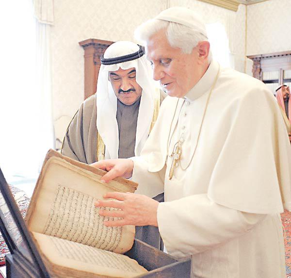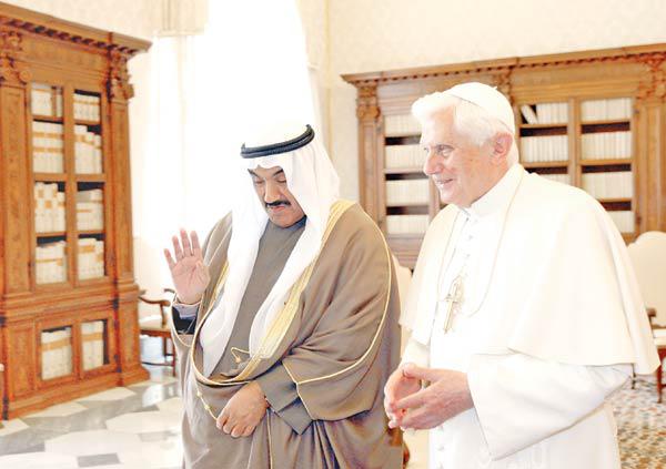سلم سمو الشيخ ناصر المحمد رئيس مجلس الوزراء البابا بنديكت السادس عشر رسالة خطية من أمير البلاد، كما أهدى إليه نسخة نادرة من القرآن الكريم.اجتمع سمو الشيخ ناصر المحمد رئيس مجلس الوزراء أمس مع البابا بنديكت السادس عشر في مستهل زيارته الرسمية الى دولة الفاتيكان.