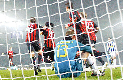 ونجح ميلان في اول فرصة حقيقية من افتتاح التسجيل بعد ركلة ركنية نفذها المتخصص اندريا بيرلو من الجهة اليسرى فأخفق البرازيلي فيليبي ميلو في ابعادها لتصل الى اليساندرو نيستا، الذي لم يجد صعوبة على الاطلاق في وضعها داخل شباك الحارس النمساوي الكسندر مانينغر (29). وتحسن اداء يوفنتوس في الشوط الثاني، وكاد يدرك التعادل بعد دقيقتين فقط بعد ركلة ركنية من دييغو وصلت الى البرازيلي كارفاليو اماوري الذي حولها برأسه الى كييلني الذي وصل متأخرا الى الكرة (47).وحاول فيرارا ان يتدارك الموقف قبل فوات الأوان فزج بالمخضرم اليساندرو دل بييرو بدلا من المخضرم الآخر البوسني حسن صالح حميديتش (61)، الا ان شيئا لم يتغير بالنسبة لأصحاب الارض، بل وجدوا أنفسهم متخلفين بفارق هدفين بعدما نجح البرازيلي رونالدينيو في اضافة الهدف الثاني لميلان بكرة رأسية لامست رأس البديل باولو دي سيغليه وسكنت شباك مانينغر، وذلك اثر ركنية ايضا نفذها بيرلو من الجهة اليسرى (71).ثم اطلق رونالدينيو رصاصة الرحمة على يوفنتوس وسجل هدفه الشخصي الثاني في الدقيقة 88 بعدما وصلته الكرة من رأسية للفرنسي ماتيو فلاميني فسددها من مسافة قريبة داخل الشباك، مسجلا هدفه الثامن هذا الموسم.(أ ف ب)