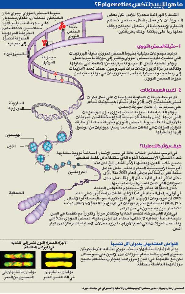 يقول جيرتل: {إذا نظرت إلى هذه الحيوانات وأيقنت بأنها متشابهة وراثياً، ولم تقدّر أهمية الإيبيجنتكس في الأمراض بعد أن أصبح بعضها أصفر اللون، بديناً ومصاباً بالسكري بعد 100 يوم، فلا أمل بأن تقدّر ذلك بصراحة}. في هذا الإطار، يقارن جيرتل الجينوم بجهاز الكمبيوتر، والإيبيجينوم بالبرمجيات التي تملي عليه التعليمات.بحسب تفسير جيرتل، تختلف الإيبيجينومات إلى حدّ كبير بين الأجناس، لذا لا يسعنا الافتراض بأن البدانة لدى البشر يمكن تجنّبها بواسطة الفيتامينات التي تتناولها الأم خلال فترة الحمل. لكن تجربة جيرتل تشكّل جزءاً من مجموعة أبحاث متنامية حملت بعض العلماء على إعادة النظر في مصير الإنسان الوراثي. فهل مصيرنا الوراثي، كالإصابة مثلاً بالاضطراب الثنائي القطب أو السرطان في سن السبعين، مُقدّر لدى تشكّل حلزوناتنا المزدوجة أم أننا نستطيع تغييره بطريقة ما؟ هل مهمّتنا تلقّي الحمض النووي أم الاعتناء به؟ أعلنت معاهد الصحة الوطنية العام الفائت أنها ستستثمر 190 مليون دولار لتسريع البحوث في مجال الإيبيجنتكس. وهكذا تكشف قائمة الأمراض التي ستُدرَس بفضل المنح المتلقاة عن نطاق هذا الحقل الناشئ: السرطان، الألزهايمر، التوحّد، الاضطراب الثنائي القطب، الفصام، الربو، مرض الكلى، المياه الزرقاء، الضمور العضلي، وغيرها من الأمراض. علم محدودحين عقد جيرتل مؤتمره الأول حول علم الإيبيجنتكس في العام 1998 في رالي، في كارولاينا الشمالية، كان هذا العلم محدوداً جداً الى حدّ أنه خشي من ألا يحضر أحد المؤتمر. لكن قدم آنذاك 160 شخصاً. لذلك استضاف جيرتل مؤتمراً آخر في العام 2005 استقطب 470 شخصاً. في هذا السياق، يشير مايكل ميني، باحث في الأدمغة في جامعة ماجيل في مونتريال: {إنه أكثر موضوع رواجاً راهناً}.حين يوقَف عمل مورثة ما عبر الإيبيجينوم، تُضاف إلى الحمض النووي عادةً مجموعة الميثيل. أدرك علماء الإحياء منذ عقود دور المَثيَلة methylation في تمايز الخلايا في الرحم، عبر جعل إحداها للجلد، وأخرى للكبد، وهكذا دواليك. يحدث التمايز الخلوي أيضاً حين يتدخّل العلماء لتحويل خلية جذعية لدى جنين إلى نوع معيّن من الخلايا. لكن منذ خمس سنوات، حين تقدّم ميني بتقرير يفيد بأن مثيلة الحمض النووي تحدث خلال مراحل الحياة كافة رداً على التغييرات البيئية، قيل له إن هذا مستحيل. بحسب جيرتل، يحدث معظم عمليات مثيلة الحمض النووي قبل الولادة وخلال مراحل الطفولة، البلوغ والشيخوخة. هذا وتشير الأبحاث إلى أن الإنسان مستقر جداً خلال فترة سن الرشد لناحية الإيبيجينوم. من جهته، أشار الباحث سايمون غريغوري في قسم الطب في جامعة ديوك إلى الرابط بين مثيلة الحمض النووي والتوحّد في مقالة نُشرت في أكتوبر(تشرين الأول) الفائت في مجلة BMC Medicine. في المقابل، يركّز معظم الدراسات الجينية الخاصة بالتوحّد على التغيّرات في التسلسل النووي بحد ذاته، لا سيما في المورثات المفقودة. تفحّص غريغوري وزملاؤه إحدى مورثات هورمون الأوكسيتوسين المتلقية والمسمّاة OXTR، واكتشفوا بأن 70 في المئة من أصل 119 شخصاً مصابين بالتوحّد في دراستهم، لديهم مورثة OXTR خاضعة للمثيلة. أمّا لدى عيّنة الأشخاص غير المصابين بالتوحّد، بلغ المعدّل نحو 40 في المئة. يُشار إلى أن الأوكسيتوسين هورمون يؤثّر في التفاعل الاجتماعي، لذا يجد أولئك الذين يعانون اضطرابات الطيف التوحدي صعوبةً في التفاعل مع الآخرين. علاجاتبما أن هذه كانت مجرّد دراسة تجريبية، تبرز إذاً ضرورة إجراء مزيد من البحوث. لكن غريغوري يقول إن الأدوية التي تغيّر عملية المثيلة قد تُتّخذ كوسيلةً جديدة للعلاج. كذلك يأمل بأن يستخدم الأطباء النتائج التي توصّل إليها لتشخيص داء التوحّد. يعقّب غريغوري: {حازت المثيلة اهتماماً كبيراً لعدد من السنوات في حقل السرطان. لكن من المثير جداً للاهتمام اكتشاف الرابط بينها وبين التوحّد}. لا يزال العلاج بالإيبيجنتكس غامضاً، لكن علماء الأورام حقّقوا نجاحات خلال استخدامه لمكافحة سرطان الدم (لوكيميا). فأصبحت مادة أز