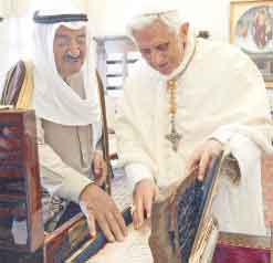 هذا وقد رافق سموه وفد رسمي ضم كلا من نائب رئيس الحرس الوطني الشيخ مشعل الأحمد ونائب رئيس مجلس الوزراء وزير الخارجية الشيخ الدكتور محمد الصباح ونائب رئيس مجلس الوزراء للشؤون الاقتصادية وزير الدولة لشؤون التنمية وزير الدولة لشؤون الاسكان الشيخ أحمد الفهد ووزير المالية مصطفى جاسم الشمالي ووزير التجارة والصناعة أحمد راشد الهارون ووكيل الديوان الأميري ابراهيم محمد الشطي ومدير مكتب سمو أمير البلاد احمد فهد الفهد والمستشار بالديوان الأميري الدكتور يوسف حمد الابراهيم والمستشار بالديوان الاميري محمد أبوالحسن ورئيس المراسم والتشريفات الأميرية الشيخ خالد العبدالله الصباح الناصر الصباح ووكيل وزارة الخارجية خالد سليمان الجارالله ورئيس غرفة تجارة وصناعة الكويت علي الغانم والنائب الأول لرئيس مجلس الادارة خالد عبدالله الصقر وعضو مكتب الغرفة أسامة محمد النصف وعضو مجلس الادارة طارق بدر السالم وعدد من كبار المسؤولين في الديوان الأميري ووزارة الخارجية ووزارة المالية.وكان سمو الأمير غادر والوفد الرسمي المرافق لسموه أمس مطار روما الدولي بجمهورية إيطاليا الصديقة متوجهاً إلى أرض الوطن.وكان في وداع سموه على ارض المطار نائب وزير المالية والاقتصاد الايطالي جوزيف فيجاس وسفير الكويت لدى إيطاليا الشيخ جابر الدعيج وسفير الكويت لدى الاتحاد السويسري ودولة الفاتيكان الدكتور سهيل خليل شحيبر. وكانت أقيمت ظهر أمس في دولة الفاتيكان مراسم رسمية لاستقبال سمو أمير البلاد الشيخ صباح الأحمد، وذلك بمناسبة زيارته الرسمية لدولة الفاتيكان الصديقة.واستعرض سموه طابور حرس الشرف، بعدها استقبل من قبل قداسة البابا بنيديكتوس السادس عشر رئيس دولة الفاتيكان الصديقة.وقد تم تبادل الأحاديث الودية التي أكدت أهمية تفعيل الحوار بين الحضارات والأديان والثقافات المختلفة والحرص على بناء جسور التلاقي بين الشعوب، وأهمية احترام الأديان وعدم المساس برموز الأديان المختلفة. وحرص سموه على تعزيز وتقوية العلاقات بين الكويت والفاتيكان، هذه العلاقات التي مضت عليها سنوات عديدة سادها السلام والتعاون والصداقة المخلصة.وبعد ذلك انضم إلى اللقاء نائب رئيس الحرس الوطني الشيخ مشعل الأحمد وأعضاء الوفد الرسمي المرافق لسموه، حيث قدم سموه مصحفا تاريخيا نادرا لقداسة البابا، ثم قدم سموه أعضاء الوفد الرسمي إلى قداسته للسلام.والتقى سموه أمس الكاردينال تاركسيو برتوني وزير دولة الفاتيكان الصديقة، يرافقه نائب رئيس الحرس الوطني الشيخ مشعل الأحمد، وذلك بمناسبة زيارة سموه الرسمية لدولة الفاتيكان الصديقة.حيث تم تبادل الأحاديث الودية التي من شأنها تعزيز الروابط بين البلدين والشعبين الصديقين، كما تطرق إلى ضرورة تعزيز التفاهم بين الأديان المختلفة من أجل أن يسود التفاهم والسلام ربوع العالم.وقد رافق سموه بالزيارة أعضاء الوفد الرسمي المرافق.وبعث سمو الأمير ببرقية شكر لقداسة البابا بنيديكتوس عقب انتهاء الزيارة الرسمية التي قام بها سموه للفاتيكان، أعرب فيها عن خالص الشكر والتقدير على الحفاوة البالغة وكرم الضيافة اللذين حظي بهما سموه والوفد المرافق له واللذين عكسا عمق العلاقات الطيبة بين البلدين الصديقين.كما أعرب سموه عن بالغ سعادته بهذه الزيارة التي قام بها للبلد الصديق والتي ستسهم في دعم أواصر التعاون بين البلدين الصديقين لما فيه مصلحتهما المشتركة، متمنيا لقداسته دوام الصحة والعافية وللعلاقات الطيبة بين البلدين الصديقين المزيد من التطور والنماء.كما بعث سموه ببرقية شكر مماثلة للكاردينال تاركسيو برتوني وزير الدولة لحاضرة الفاتيكان.