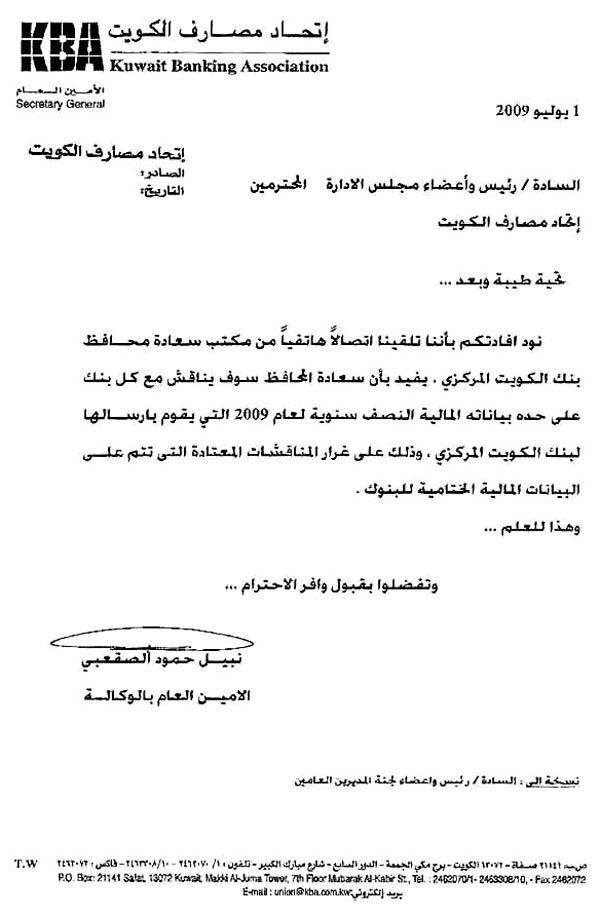 خاطب اتحاد المصارف الكويتية كل البنوك بأنه تلقى اتصالا هاتفيا من مكتب محافظ بنك الكويت المركزي، بهدف مناقشة البيانات المالية نصف السنوية للعام الحالي، وهو إجراء يطلبه المحافظ لأول مرة، إذ كانت هذه المناقشات تتم فقط على البيانات السنوية النهائية.علمت «الجريدة» أن محافظ بنك الكويت المركزي الشيخ سالم عبدالعزيز الصباح طلب من اتحاد المصارف الكويتية الإيعاز إلى كل البنوك المحلية بطلبه الاجتماع مع كل بنك على حدة، بهدف مناقشة البيانات المالية نصف السنوية للعام الحالي، والتي سيتم إرسالها إلى «المركزي»، إذ من المعتاد أن يقوم «المركزي» بمناقشة البنوك عن البيانات المالية الختامية وليست نصف السنوية.