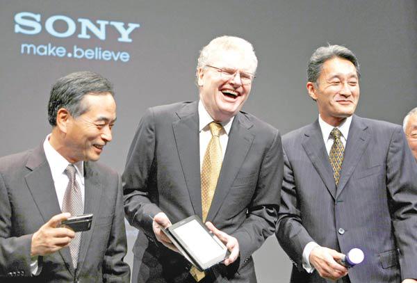 تهدف شركة سوني اليابانية إلى كسب 5 في المئة من هامش الأرباح التشغيلية خلال السنوات الثلاث المقبلة. (وفي الصورة) يبدو نائب الرئيس التنفيذي لشركة سوني هيروشي يوشيوكا، والرئيس التنفيذي هاوارد سترينجر ورئيس المنتجات والمواد الاستهلاكية والأجهزة في الشركة كازو هيراي، بعد مؤتمر صحافي عُقِد في طوكيو أمس. (رويترز)