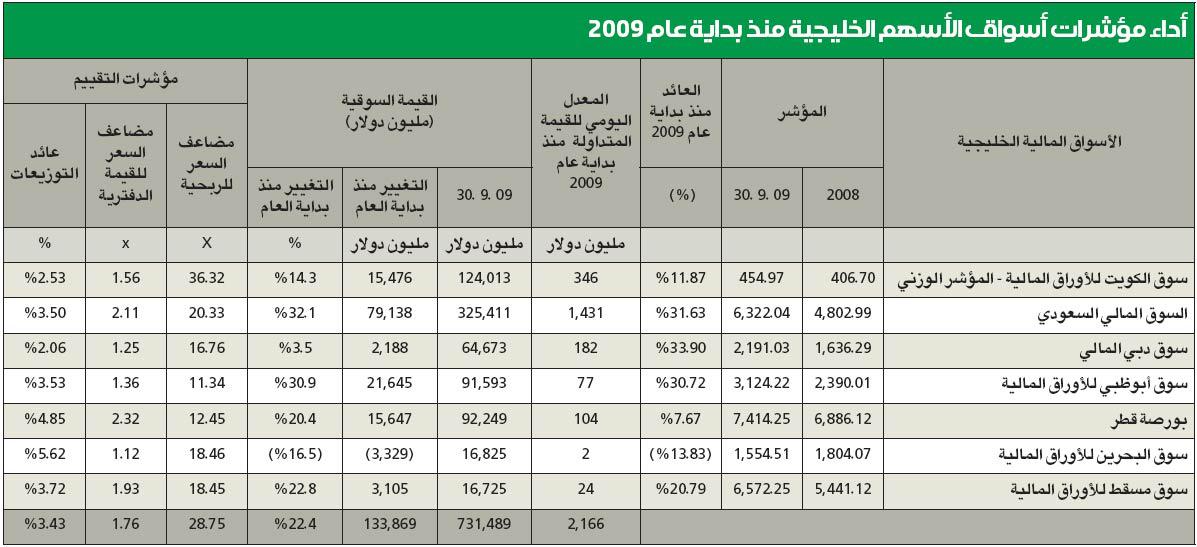 استطاعت معظم أسواق الأسهم الخليجية أن تعوض الخسائر التي لحقت بها سابقاً بعد وصولها إلى أدنى مستويات لها خلال الربع الأول من العام الحالي، ثم استطاعت أن تحقق ارتفاعاً في مؤشراتها خلال الأربعة أشهر الأخيرة باستثناء سوق البحرين للأوراق المالية الذي بلغت خسائره منذ بداية العام الحالي ما نسبته 13.83 في المئة ويعود السبب في ذلك إلى تركيبة السوق، إذ يشكل قطاع البنوك وشركات الاستثمار حوالي 76 في المئة من إجمالي القيمة السوقية التي بدورها تعرضت لتقلبات الأسواق المالية وانخفاض أسعار الأصول.سوق الكويت للأوراق الماليةبعد أن سجل ارتفاعاً في أداء مؤشره الوزني خلال شهر أغسطس الماضي بنسبة 6.66 المئة، وذلك رغم النتائج المالية المخيبة للآمال والخسائر التي منيت بها معظم الشركات المدرجة عاد المؤشر الوزني إلى سوق الكويت للأوراق المالية إلى اللون الأحمر لينخفض بنسبة 2.44 في المئة خلال شهر سبتمبر مقارنة بإغلاق شهر أغسطس ليغلق عند مستوى 454.97 نقطة، وبذلك يكون المؤشر الوحيد الذي سجل انخفاضاً مقارنة بمؤشرات أسواق الأسهم الخليجية.بعد أن كان سهم شركة زين السبب الرئيسي لارتفاع مؤشر سوق الكويت للأوراق المالية خلال شهر أغسطس، وذلك على خلفية أنباء عن صفقة محتملة تشمل بيع نسبة 46 في المئة من رأسمال الشركة لمستثمر أجنبي إذ لم تتضح الرؤية بعد حول اتمام تلك الصفقة، مما نتج عنه عدم ارتياح لدى المستثمرين لتنخفض نسبة التداول على سهم زين في شهر سبتمبر بحوالي 68 في المئة مقارنة بتداولات شهر أغسطس، وقد انخفض سهم زين بنسبة 14.47 في المئة ليغلق في نهاية شهر سبتمبر عند سعر 1.300 دينار كويتي مقارنة بإغلاق شهر أغسطس. كما يسود جو من الترقب والحذر لدى معظم المستثمرين مع قرب موعد إعلان النتائج المالية لفترة التسعة أشهر المنتهية في 30 سبتمبر 2009، وذلك لتتضح الصورة لديهم حول الوضع المالي لبعض الشركات وإمكانية متابعة أعمالها في ظل أزمة السيولة التي يعانيها السوق.... والأسهم السعودياستطاع سوق الأسهم السعودي أن يحقق ارتفاعات قوية منذ بداية العام الحالي، إذ سجل ارتفاعاً في مؤشره نسبته 31.63 في المئة مدعوماً بالأداء الجيد لأسهم قطاع البنوك وأسهم قطاع البتروكيماويات، إذ لعبت أسهم القطاع المصرفي دوراً مهماً في تحديد الاتجاه الإيجابي لأداء مؤشر السوق السعودي، وذلك على خلفية النتائج المالية للنصف الأول من العام 2009 والتي جاءت إيجابية بالرغم من آثار الأزمة المالية التي دفعت البنوك إلى احتساب مخصصات كبيرة لمواجهة الخسائر الناجمة عنها. كما ساهمت الأنباء عن تسويات في مديونية مجموعتي سعد والقصيبي مع البنوك السعودية في خلق جو من الثقة والارتياح لدى المستثمرين في القطاع المصرفي. ... وأبوظبي للأوراق المالية ودبي المالي بعد انتهاء الشركات من إعلان نتائجها المالية للربع الثاني من العام الحالي التي جاءت إيجابية رغم تراجعها بسبب الأزمة المالية وتراجع أسعار العقارات، شهدت أسواق المال الإمارتية ارتفاعات قوية خلال شهري أغسطس وسبتمبر، مما عزز من أرباحها منذ بداية العام إذ تصدر كل من سوق دبي المالي وسوق أبوظبي للأوراق المالية قائمة أسواق الأسهم الخليجية من حيث الأداء منذ بداية السنة، إذ سجلا ارتفاعاً بنسبة 33.90 في المئة و30.72 في المئة على التوالي. ... وقطرأظهرت أحدث التوقعات أن الاقتصاد القطري يعتبر من أسرع الاقتصادات نمواً بالرغم من الانكماش العالمي السائد مدعوماً بالوضع المالي القوي للدولة وارتفاع معدل دخل الفرد، لذلك فقد حافظ مؤشر سوق قطر المالي على اتجاهه التصاعدي خلال شهر سبتمبر، إذ حافظ المؤشر على مستواه فوق الـ7000 نقطة ليغلق في نهاية الشهر عند مستوى الـ7414.25 نقطة وبارتفاع نسبته 4.17 في المئة. ساهم الأداء الجيد للأسهم الثقيلة وبالتحديد شركة صناعات قطر ومعظم البنوك في دعم أداء مؤشر السوق خلال شهر سبتمبر 2009، حيث ارتفعت القيمة السوقية لقطاع البنوك بمقدار 4.27 مليارات ريال قطري خلال شهر سبتمبر.... والبحرين للأوراق الماليةاستطاع سوق الب