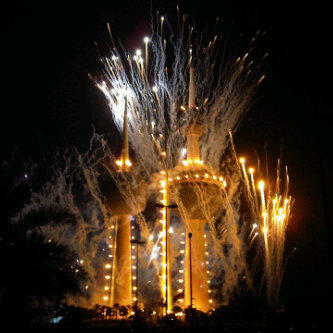 أضاءت سماء الكويت وتلألأت مساء اليوم بمختلف الالوان و الاضواء والاشكال في عرض هو الاول من نوعه على مستوى الشرق الاوسط ابتهاجا واحتفالا بالذكرى ال50 للاستقلال وال20 للتحرير ومرور خمس سنوات على تولي سمو امير البلاد مقاليد الحكم.وقال المدير التنفيذي لشركة (بارتي لينك) الكويتية المتحالفة مع شركات بلجيكية وفرنسية واسبانية المهندس حسان القدسي لوكالة الانباء الكويتية (كونا) ان اللجنة العليا للاحتفالات الوطنية استخدمت كمية تفوق ال16 طنا من الالعاب النارية التي تم استيرادها من اسبانيا وفرنسا وبلجيكا في هذا العرض غير المسبوق. واضاف القدسي ان هذه الاحتفالية شملت عروضا ومفرقعات وعروضا ليزرية سمعية بصرية على ابراج الكويت التي تعكس في اشكالها وتصاميمها تاريخ وحضارة الكويت منذ نشأتها مرورا بالاستقلال الى النهضة الشاملة التي تتواصل في ايامنا هذه.وذكر ان العروض ابدعت تقنيا بالصوت والصورة وتم ربطها باذاعة (اف.ام) الى جانب التصوير البصري جوا وبحرا وبرا وشملت المساحة التي غطتها هذه العروض والانارة نحو 2ر4 كيلومترات مربعة بدءا بالابراج وحتى الجزيرة الخضراء كما تم ربط العرض الطيفي بخمس شاشات عملاقة وزعت على مناطق رئيسية في البلاد وقد استغرقت العروض نحو ساعة كاملة.ووجه التهنئة الى الكويت قيادة وحكومة وشعبا و" هي البلد الذي يستحق كل الخير وجدير باحتفالاته الوطنية ويكفي الكويت فخرا واعتزازا تزامن اعيادها الوطنية هذه الايام مع بعضها بعضا في فرحة تشمل المواطنين والمقيمين وكل الذين يعيشون على هذه الارض الطيبة".