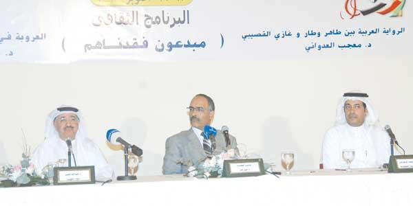 تضمنت محاضرة "مبدعون فقدناهم"، التي اقيمت في المقهى الثقافي في معرض الكتاب، محورين، الأول: العروبة في شعر أحمد السقاف، قدمه الباحث الكويتي د. عبدالله القتم، وفي المحور الثاني تحدث الناقد السعودي د. معجب العدواني عن الروائيين الطاهر وطّار وغازي القصيبي: التوازي والاختلاف.في القسم الأول من المحاضرة، تحدث د. عبدالله القتم عن شاعرية السقاف، مشيراً إلى أن الشعر عند السقاف رسالة عظيمة الأهمية استخدمها لبث آرائه وأفكاره، فكان صريحاً واضحاً، تميز بموضوع أخذ لبه وفكره، ألا وهو العروبة، فالعروبة في دمه وسلوكه، يرى أن الوطن الكويت، ولكنه اختزن في عقله الوطن العربي كله، فجعله وطنه، من يقرأ قصائده يرى ذلك واضحا، فتغنى بالبلاد العربية جميعا، وترنم بالمدن العربية عشقا وهياما.يشير القتم إلى أن فكرة السقاف عن العروبة تنقسم إلى عدة أقسام، أولا: العروبة في الوطن الصغير والكبير، ثانيا: العروبة في القيم والمبادئ، ثالثا: العروبة في النهضة والحث عليها، رابعا: العروبة دفاع عنها وهجوم لأعدائها.ويضيف: "يمثل غزو العراق للكويت كارثة ومصيبة فادحة، إذ لم يتصور أن يقدم طاغية العراق على مثل هذه الفعلة، خاصة أن العروبة في دمه ووجدانه، فكان إحساسه بالألم بالغاً، وجرح الغزو غائراً في نفسه، لذا لا عجب أن يصدر ديواناً كاملاً عن الغزو البغيض بعنوان نكبة الكويت"، ويقول:معذرة إن خانني الكلام/ ففكري المفجوع في ذهول/من أين لي التعبير يا ريس؟/ وهل تبقى ما يصح أن يقال؟مبادئ جئت بها لم تحترم/ وجيرة مجدتها غصب بدموكل ما رددته قد انهزم/ أهكذا جزاؤنا؟أهكذا وفاؤنا؟ ويختم القتم دراسته بقوله: "لقد وازن السقاف بين متطلبات الحياة، وما في النفس من تطلعات، فهو من الذين عشقوا الحياة، حلوها ومرها، ولكنه عرف أن الحلاوة لا تأتي من غير كفاح وجد واجتهاد، لذا كان صادقا مع أفكاره مؤمناً بقيمه ومبادئه، فلم ينحرف عما رآه من إيمان بالعروبة وقيمها، ولكن الحياة لا تخلو ممن يعاند القيم العربية، وكان لا بدل له من الوقوف في وجه هؤلاء، مدافعا عما آمن به، وجاء شعره موافقاً لما عنده من آراء وقيم ومبادئ.لا شك في أن العروبة أخذت من السقاف جل اهتمامه، فتمثلها في سلوكه وشعره، ولم ينحرف عن هذا الخط الذي اختطه لنفسه، ففخر بالعروبة، ومجدها، وتمثلها في حياته، وأضحت سمة بارزة عليه، فما ذكرت العروبة إلا وكان السقاف عرابها، ومنظرها، وقائد جمعها.التوازي والاختلافوفي القسم الثاني من المحاضرة، تحدث د. معجب العدواني عن ملامح التشابه وعناصر الاختلاف في تجربتين روائيتين "وطّار والقصيبي: التوازي والاختلاف"، متناولاً عبر ورقته البحثية جانبين، الأول التجربة خارج النص وهو الجانب المتصل بمواقف الروائيين من الكتابة والرقابة والدين والاستعمار والظلم، أما الجانب الآخر فركز على التجربة النصية، ويضم هذا الجانب ثلاث بؤر مهمة متصلة بنصوص الروائي: ما يتصل بالجنون ثيمة وخطاباً، وما يتصل بالمكان الروائي، وتوظيف التراث الأدبي، مضيفا: "لم يتفق القصيبي ووطّار في انهما من أشهر الروائيين العرب فحسب، بل امتدت هذه العلاقة المتوافقة غير المنظورة إلى جوانب شتى تتصل بالمبدع والإبداع، وتنتهي بتوافق في العام والشهر، تاريخ وفاة علمين روائيين أغسطس 2010، كان الفرق الزمني ثلاثة أيام فصلت بين خسارتين من خميس وطّار إلى أحد القصيبي".يؤكد العدواني تفوق القصيبي ووطّار على أقرانهما في الكتابة الأدبية، بقوله: "كسرا حدود الكتابة إلى التنقل بين الأجناس، فكتب القصيبي الشعر والرواية ونظّر في التنمية، وكتب وطّار القصة القصيرة والرواية المسرحية، ونقلت أعمالهما إلى لغات في الشرق والغرب، فاجتازا بذلك الأداء العلمي المتفوق بؤر المركز وزوايا الأطراف".ويضيف: "يعد القصيبي ووطّار الأكثر تأثيراً في الإنتاج المحلي في الرواية السعودية والجزائرية، فحضورهما الروائي المؤثر كماً وكيفاً لا يخفى على دارس ومتابع الرواية في العالم العربي".كما تطرق العدواني إلى موقفهما من الرقابة التي