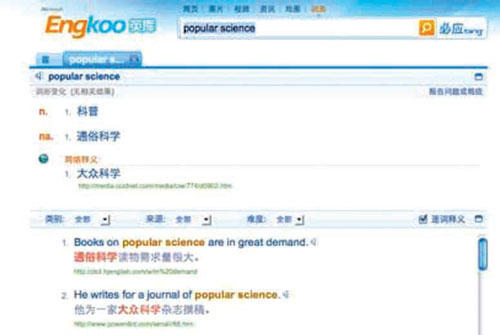 يعدّ الباحثون في شركة "مايكروسوفت" في بكين معجماً الكترونياً من اللغة الصينية إلى الإنكليزية قد يصبح نموذجاً لأدوات التعليم اللغوي التي تشكّل جسراً بين لغتين. يستقي موقع Engkoo.com قاعدة بياناته من شبكة الإنترنت بحد ذاتها، مفهرساً المواقع المتوافرة باللغتين الانكليزية والصينية، باحثاً عن معاجم موجودة على الشبكة، ومستخرجاً مصادر أخرى لإنشاء مورد غني للتعلم والترجمة.عبر الاعتماد على الإنترنت الدائم التطوّر، يجب أن يتمكن موقع Engkoo الذي يعني "القنطرة الإنكليزية" من البقاء على اطّلاع بأي تغييرات في التعابير العامية والمصطلحات في اللغة المصدر وتلك التي يُترجم إليها. نظراً، يجب أن يتمكن من إيجاد الأخطاء أو الترجمات الخاطئة بسهولة أكبر، إذ من غير المرجّح أن يشيع خطأ في شبكة الإنترنت مجدداً. حين يبحث المستخدم عن كلمة أو جملة في أي من اللغتين، يتصفّح البرنامج الذي يقود Engkoo قاعدة البيانات لإيجاد المعلومات ذات الصلة ويعتمد على إحصاءات لإنتاج ترجمة دقيقة قدر الإمكان. يُذكَر أن شركة "مايكروسوفت" ستعمد لاحقاً إلى تكييف البرنامج مع لغات أخرى لكن هذه المرحلة الأولية تتركّز على الترجمة من الصينية إلى الإنكليزية. وهكذا حيث ممكن، يقيم البرنامج رابطاً مع المصادر التي استقى منها البيانات الأساسية ويستطيع غالباً توفير أمثلة مترجمة عن كلمة أو جملة. يسمح Engkoo أيضاً بخوض تجربة في مجال الوسائط المتعددة. تتوافر ترجمات سمعية مولّدة عبر الكمبيوتر لكلمات كثيرة وجمل إنكليزية لمساعدة المتحدثين الصينيين في طريقة اللفظ، ويطوِّر الباحثون راهناً مكتبة إملاء مصوّرة كي يتسنى للمستخدمين رؤية كيفية تحريك المتحدّثين بلغتهم الأم شفاههم.من جانب آخر، تتمثل الخطوة اللاحقة في إظهار حركة اللسان داخل الفم، خطوة ضرورية لتعلّم اللفظ إنما متوارية عن الأنظار غالباً. بدأ الباحثون مسبقاً بجمع بيانات ما فوق الصوتية للمكتبة، لكن لا داع للقلق لمن يجد ذلك النوع من الصور منفّراً، لأن الصور ما فوق الصوتية البيضاء والسوداء ستُحوّل إلى رسوم متحركة لجعلها مقبولة. فضلاً عن ذلك، يجري العمل على تطبيق للهاتف الخليوي سيُشغّل على الهواتف المزوّدة ببرنامج Windows، وتسمح بالترجمة على الدوام. لعلنا نشهد اليوم على الخطوات الحقيقية الأولى باتجاه مترجم عالمي يستطيع المرء الاحتفاظ به في جيبه لترجمة أي لغة إلى لغته.