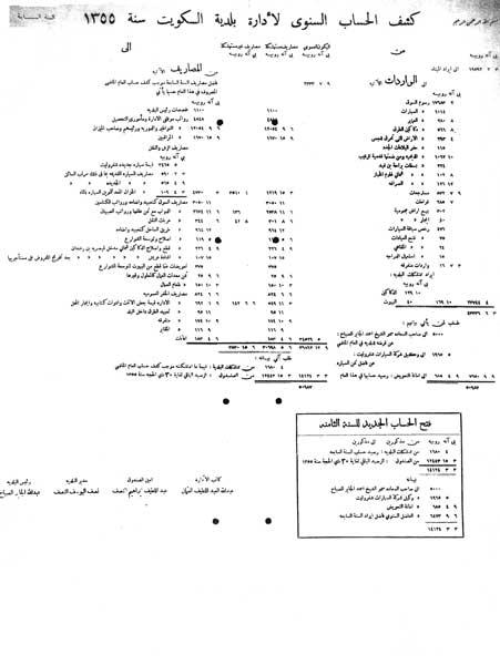 وثيقة جميلة ونادرة ننشرها اليوم وتتناول جانباً مختلفاً هذه المرة، هذه الوثيقة هي عبارة عن "كشف للحساب السنوي لإدارة البلدية لعام 1355 هجري".لقد تأسست بلدية الكويت في عام 1929 عندما تقدم بالفكرة الشيخ يوسف بن عيسى القناعي بعد زيارته للبحرين وإعجابه بنشاطات بلديتها ونظامها، ولذلك اقترح الفكرة على الشيخ أحمد الجابر الصباح أمير الكويت الذي رحب بالفكرة ووافق على تنفيذها، وثيقتنا تشير إلى بنود الصرف في ذلك العام والموارد المالية وغير ذلك، ولكي نوضح للقارئ تفاصيل بنود الصرف، نقول إن الوثيقة تشير إلى ما يلي: