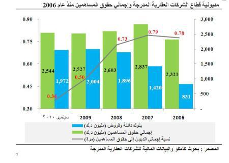 وأضاف التقرير الذي يتناول وضع الميزانية العمومية وربحية قطاع الشركات العقارية المدرجة في بورصة الكويت، أن أصول القطاع سجلت ارتفاعاً طفيفاً بنسبة 0.8 في المئة خلال فترة التسعة أشهر المنتهية من العام الحالي لتصل إلى 5.73 مليارات دينار كويتي مقارنة بإجمالي أصول بلغت 5.68 مليارات دينار كويتي في نهاية عام 2009، ويعود السبب في ذلك إلى الركود الحاصل منذ بداية عام 2009 في السوق العقاري والانكماش في سوق الائتمان وتأثيرهما في نشاط الشركات العاملة في القطاع والتباطؤ في تنفيذ المشاريع العقارية، بالإضافة إلى عزوف المطورين العقاريين عن الدخول في مشاريع جديدة ضمن قانون الـ"BOT" لما يتضمنه من شروط قاسية على المطورين، كما أن عدداً كبيراً من الشركات العقارية يعاني صعوبة في تسويق مشاريعه خصوصاً التجارية منها بغرض تأجير وحداتها أو بيعها، وذلك نظراً لشح السيولة وعدم قدرة المستأجرين أو الملاك على زيادة الإنفاق. وبالمقارنة مع الأعوام السابقة يتبين أن عام 2009 كان من أسوأ الأعوام التي شهدها قطاع الشركات العقارية المدرجة بعكس الأعوام السابقة، حين استطاعت أن تسجل أصول القطاع نسب نمو مرتفعة بمعدل نمو سنوي مركب تخطى