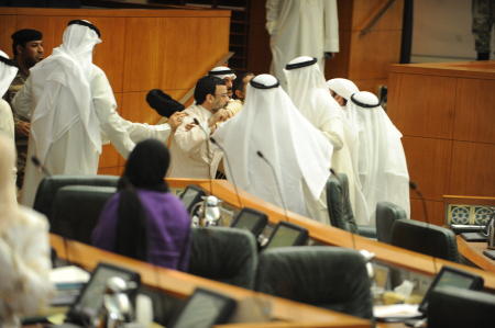 وتحول سجال طائفي بين النابين حسين القلاف ومحمد هايف حول معتقلي غوانتانامو الى معركة وتبادل عنيف بالضرب بين كل من (الحربش والمطوع والقلاف والنملان) داخل قاعة عبدالله السالم، تلتها فزعة طائفية من بعض النواب والجمهور، الامر الذي حدى بنائب رئيس المجلس عبدالله الرومي برفع الجلسة حيث قام الحرس بإخراج الجمهور واخلاء القاعة.وكانت جلسة اليوم الاربعاء تبحث "مسالة الكويتيين المعتقلين في غوانتانامو بحضور وفد من المحامين الاميركيين الذين يدافعون عنهم فقال النائب حسين القلاف ان الموجودين في هذا المعتقل هم من خريجي القاعدة". وسارع النائب جمعان الحربش الى الرد قائلا ان موضوع الجلسة هو المعتقلين في غوانتانامو وليس ما تتحدث عنه وحاول اخرون التدخل ودبت الفوضى فتبادل النواب اللكمات والضرب بالعقل.وتعرض النائب عدنان المطوع لإصابة تحت العين مباشرة وتم إخراجه من القاعة واجراء إسعافات أولية له، كما تعرض النائب سالم النملان لجروح في الوجه والرقبة نتيجة تشابكه مع النائبان المطوع القلاف.واستمر التشابك بين النواب بالأيدي والعقل بالقاعة المجاورة لقاعة عبدالله السالم، واستمر الضرب بالاستراحة بين القلاف والمطوع والحربش والصواغ والنملان.