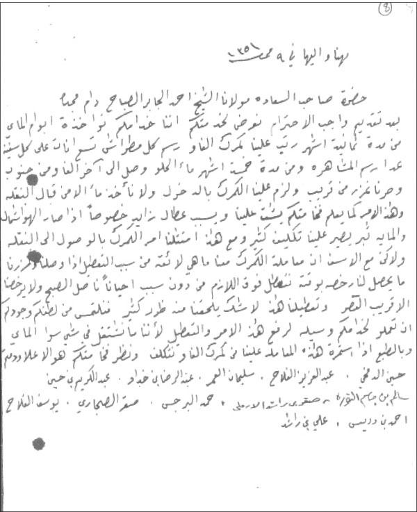 وقام الشيخ أحمد من فوره في نفس اليوم بكتابة رسالة إلى المعتمد البريطاني في الكويت يبلغه فيها بالمشكلة، ويطلب منه أن يبلغ حكومته الأمر لاتخاذ ما يمكن اتخاذه للقضاء على هذه المشكلة، وأرفق مع رسالته كتاب النواخذة. وإليكم النص الحرفي لكتاب النواخذة:«منها واليها 9 محرم 1351 حضرة صاحب السعادة مولانا الشيخ احمد الجابر الصباح دام مجده،،بعد تقديم واجب الاحترام، نعرض لخدمتكم أننا خدامكم نواخذة أبوام الماي، من مدة ثمانية أشهر ركّب علينا كمرك الفاو رسم كل مطراش تسع آنات على كل سفينة عدا رسم المشاهرة، ومن مدة خمسة أشهر ماء الحلو وصل الى آخر الفاو ومن جنوب، وصرنا غزر من قريب، ولزّم علينا الكمرك بالدخول، ولا ناخذ ماء الا من قبال (مقابل) البنغلة، وهذا الامر، كما يعلم فخامتكم، يشق علينا، ويسبب عطال زايد، خصوصا اذا صار الهوا شمال، والمايه ثبر، يصير علينا تكليف كثير، ومع هذا امتثلنا أمر الكمرك بالوصول الى البنغلة، ولكن مع الاسف ان معاملة الكمرك معنا ماهي لائقة من سبب التعطيل، اذا وصلنا وابرزنا، ما يحصل لنا رخصة بوقته نتعطل فوق اللازم من دون سبب، احيانا ناصل الصبح ولا يرخصنا الا قريب العصر، وتعطيلنا هذا لاشك يلحقنا منه ضرر كثير. فنلتمس من لطفكم وجودكم ان تعملوا لخدامكم وسيلة لرفع هذا الامر والتعطيل، لاننا ما نشتغل في شيء سوا الماي، وبالطبع اذا استمرت هذه المعاملة علينا في كمرك الفاو نتكلف، ونظر فخامتكم هو الاعلا، ودمتم.»وورد في ذيل الوثيقة الأسماء التالية:حسين الدمخي، عبدالعزيز الفلاح، سليمان العمر، عبد الرضا بن خداو، عبدالكريم بن حسين، سالم بن جاسم التورة، صقر بن راشد الارملي، حمد البرجس، صقر السجاري، يوسف الفلاح، أحمد بن إدريس، علي بن راشد.وإلى اللقاء في الحلقة المقبلة مع وثيقة جديدة.