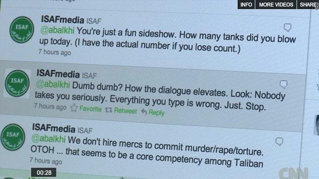 وعلى مدار الأشهر الأخيرة، شهد موقع التواصل الاجتماعي مواجهات كلامية بين كلا المستخدمين: "إيساف ميديا" - المكتب الصحفي الخاص بقوة المساعدة الأمنية الدولية "إيساف" التابعة للناتو؛ و"أبالكى" نيابة عن طالبان.وبلغت "المواجهات" بين الطرفين مؤخراً أوجها، إلى حد تبادل الاتهامات الشخصية، الخميس على ضوء مزاعم بأن "الناتو" يستأجر مرتزقة أفغان يعملون لحسابه مما أدى إلى تراشق لفظى بين الطرفين.@إيسافميديا: أنظر لا أحد يأخذكم على محمل الجد.. كل ما تطبعه خطأ، عليك التوقف.فرد "أبالكي" (طالبان): "لهذا تم اختيارك لأداء هذه الوظيفة، فلو لم أكن موجوداً هناك، فلن تكون لديك وظيفة." ويشار إلى CNN حاولت الحصول على تعقيب من الجانبين بشأن الحرب الإلكترونية بينهما، إلا أن الجانبين رفضا الحديث أمام الكاميرا والكشف عن هوية "الناطقين الإلكترونين" عنهما.ويذكر أن الحرب الإلكترونية تدخل في سياق حرب معلومات متنامية تشهدها أفغانستان في الآونة الأخيرة، فالحلف الأطلسي ينظر إلى الحرب الأفغانية التي تدخل عامها العاشر، باعتبارها حرب مفاهيم، لذلك لجأ ومنذ فترة طويلة إلى وسائل الإعلام التقليدية لإيصال رسالته، ويبدو مصمما على أن تكون له يد العليا في وسائل التواصل الإجتماعي كذلك.وتراشق الجانبان سيلاً من المراسلات إثر توارد تقارير باعتقال الناطق باسم طالبان، وقالت الحركة في توتر: لماذا تعتقلون المدنيين؟فرد إيسافميديا: "هل تريد القول بإنه ليس عضوا في طالبان؟ هل هذا ما تريد أن يعتقده الجميع؟ووضع "أبالكي" حداً للمراسلات المتبادلة بقوله: هل تعلم.. ليس أي أحد هناك يتم الدفع له ليجلس في طاولة طيلة اليوم للاستخدام تويتر، فلك منا حياته الخاصة."وانتقد البعض الحرب الكلامية بين الجانبي، من بينهم لطف الله نجافيزادا، من قناة "تولو تي في"، أكبر شركات التلفزة في أفغانستان: "بعضها مضحك وأنا أتساءل عن أسباب رد إيساف.. يجب عليها التوقف إذ قد لا تضع طالبان قيد الاعتبار قواعد التخاطب، من الأفضل لهم الابتعاد عن مثل هذه الاتصالات فقد تكون غير مجدية لهم."