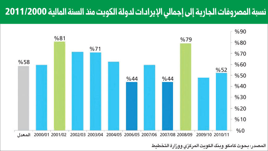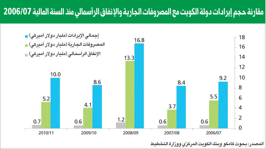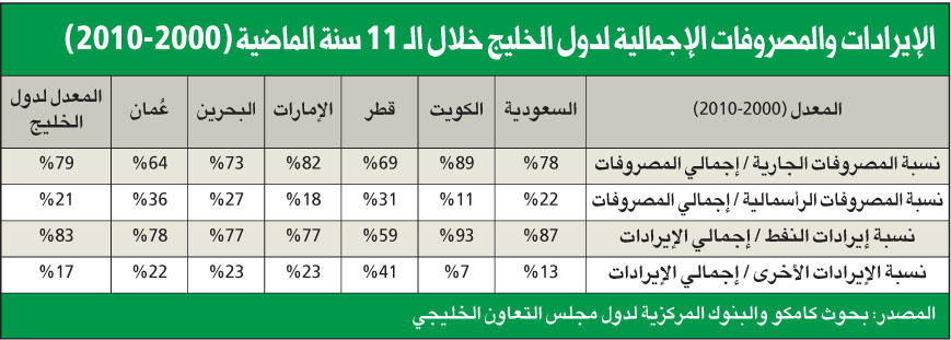 بلغ إجمالي إيرادات النفط في الكويت خلال الـ11 سنة مالية الأخيرة نحو 130 مليار دينار، والإيرادات غير النفطية خلال الفترة نفسها 10.4 مليارات دينار، وشكلت إيرادات النفط 93 في المئة من إجمالي الإيرادات، وهي النسبة العليا في دول الخليج.بعد الأزمة المالية العالمية التي بدأت في سبتمبر من عام 2008 التي كان لها تداعيات سلبية على اقتصادات الدول المتقدمة والنامية حيث نتج عنها أزمة اقتصادية عميقة وتهاوٍ في أسعار الأصول، بدأت الدول المتطورة باتباع سياسات التحفيز الاقتصادي للتخفيف من تداعيات الأزمة والعودة باقتصاداتها إلى النمو الإيجابي.وإعمالا لذلك أصدرت إدارة بحوث الاستثمار في شركة مشاريع الكويت الاستثمارية لإدارة الأصول (كامكو) تقريرا عن سياسات التحفيز الاقتصادي (Fiscal Stimulus Plans) في دول مجلس التعاون الخليجي ومدى تأثيرها على النمو الاقتصادي وبالتحديد القطاع الخاص، قالت فيه، إن دول مجلس التعاون الخليجي حذت حذو الدول المتقدمة وبدأت تطبيق سلة من سياسات التحفيز الاقتصادي والإنفاق على المشاريع الإنمائية التي تهدف بالأساس إلى التخفيف من الآثار السلبية لانخفاض أسعار النفط حيث تعتبر إيرادات النفط والغاز العامود الأساسي لاقتصاد تلك الدول.وأوضح التقرير ان تلك السياسة ارتكزت على التوجه نحو الإنفاق على مشاريع البنى التحتية غير النفطية وزيادة الطاقة الإنتاجية للكهرباء والمياه إضافة إلى تطوير القطاعات الحيوية التي تعتبر الأساس في التنمية الاقتصادية المستدامة مثل قطاعات التعليم والصحة والخدمات الاجتماعية.وشهدنا في المملكة العربية السعودية خطة خمسية في عام 2009 بقيمة 400 مليار دولار أميركي ومثلها في الكويت بقيمة 100 مليار دولار أميركي وكذلك في قطر والإمارات حيث رصدت المليارات للمشاريع الإنمائية والعمرانية.النفقات الاستثماريةوتعتبر زيادة حصة القطاع الخاص من النشاط الاقتصادي الإجمالي في دول الخليج الذي يعتمد اقتصادها على إيرادات النفط والقطاع العام الوسيلة الاقتصادية الوحيدة والناجحة لتحصين دعائم الاقتصاد من تقلبات أسعار النفط والرقي بالاقتصاد إلى مستويات جيدة من النمو الحقيقي والمستدام في المدى البعيد.واجرى صندوق النقد الدولي مؤخراً دراسة احصائية عن مدى فعالية سياسة التحفيز الاقتصادي في دول الخليج ومساهمتها في التقليل من الاثار السلبية لتذبذب اسعار النفط والواردات من السلع الاساسية حيث تعتبر دول الخليج من اكثر الدول اعتماداَ على اليد العاملة الأجنبية واستيراد السلع.وخلصت الدراسة إلى اعتبار سياسات التحفيز الاقتصادي وزيادة الانفاق الرأسمالي على مشاريع التنمية الوسيلة المتاحة والناجحة لزيادة دور القطاع الخاص في الاقتصاد وذلك عن طريق إشراكه في تمويل وتنفيذ مشاريع البنى التحتية ورفع ثقة المستثمر والمستهلك في الوقت نفسه.فعلى سبيل المثال، أشارت الدراسة إلى أن زيادة الإنفاق الحكومي في المملكة العربية السعودية بنسبة 15 في المئة قد ينتج عنه زيادة في الناتج المحلي غير النفطي بنسبة 2 في المئة في المدى القصير و5 في المئة خلال ثلاث سنوات في حال استمر الانفاق عند معدلاته التاريخية.ولذلك نستطيع القول ان النتائج الايجابية لأي زيادة في المصروفات الجارية (رواتب وغيرها) على النمو الاقتصادي تعتبر ضعيفة جداً مقارنة بالانفاق الرأسمالي المنتج الذي بدوره يستطيع دفع النمو الاقتصادي وهذا ما شهدناه في المملكة العربية السعودية خلال مرحلة الازمة المالية حيث استطاعت من خلال التدخل في الوقت المناسب في دفع النمو في القطاع غير النفطي وذلك عن طريق الإنفاق الضخم على مشاريع البنى التحتية والخدمات الاجتماعية والصحية والتعليم.وفي ظل اقتصاد خليجي يعتمد بالأساس على إيرادات النفط، تعتبر سياسة الانفاق الحكومي الوسيلة الاقتصادية المتاحة والفعالة للتقليل من تبعات انخفاض أسعار النفط وتنويع الاقتصاد ومصادر الدخل شرط أن تتوجه تلك السياسة نحو الانفاق الرأسمالي على المشاريع المنتجة التي تؤمن النمو 