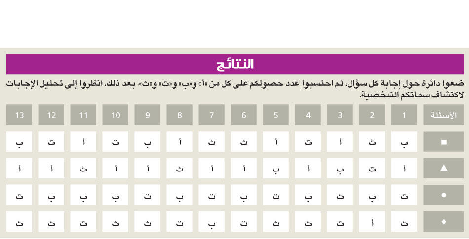 هل ننتمي، نحن، إلى مجموعة الـ «أنا» التي تعبر عن نفسها بهدوء أو إلى مجموعة «أنا سوف» التي تفرض نفسها بالقوة؟ يمكن أن تأخذ الـ «أنا»، الصورة التي نملكها عن أنفسنا والتي نعكسها ليراها الآخرون، حجمًا أكبر أو أصغر من حقيقتها أو أن تكون في أحسن الأحوال على توازن بين الحالتين.بحسب أحد المحللين النفسيين، يتطلب التوازن الصحيح وجود «أنا» تسمح بالتوفيق بين الانفتاح على الآخرين والتعبير الهادئ عن الذات، وأن نكون مدركين لقدراتنا ولمحدوديتنا وأن نتعايش مع الأمرين. إذن بحسب الأطباء والمحللين النفسيين، يعاني كل من يملك مساحة «أنا» كبيرة ومساحة «أنا» صغيرة المشكلة ذاتها: نقص في احترام الذات يسبب العذاب لصاحبه.الـ «أنا» المبالغ في تقديرها تطغى لتستمر، بينما تحاول الـ «أنا» التي تقلل من شأن ذاتها أن تكون غير مرئية.قيمة الأناوفق دراسات أميركية تتناول النرجسية، يتبيّن أن تنامي الشعور بقيمةالـ «أنا» قد يزيد في السنوات الأخيرة، ويصل إلى ذروته بين الذين تتراوح أعمارهم بين 20 و30 سنة، وقد ارتفع عدد هؤلاء بنسبة 30% منذ الثمانينات! من تلفزيون الواقع الذي ينفخ الـ «أنا» المتداعي لشبان مجهولين يعانون شيئًا من الضياع، الى الموضة التي تدعو كل شخص إلى أن يكون رمزًا لذاته وأن يكون له أسلوبه الخاص، لا يكفّ فتيات وفتيان عن النظر إلى المرآة ويضيعون في انعكاس صورتهم الخاصة. لكن هذه الظاهرة لا تنحصر بهذه الفئة العمرية فحسب، بل تتعداها لتشمل الفئات الأخرى.حددنا مساحة الـ «أنا» الخاصة بكم، بتصميم هذا الاختبار بمساعدة أحد المحللين النفسيين:1 معرفة كيفية تسويق الذات: ما رأيك بهذه المقدرة؟■ أمر يتخطى قدراتك.▲ تتدبر أمورك بشكل جيد.● يتوقف الأمر على مزاجك وعلى الأشخاص الذين بمواجهتك.♦ شر لا بد منه أحيانًا.2 ارتكبت خطأ، ولا مناص لك من الاعتراف به:■ تنحني أمام الوقائع.▲ تبتلع شعورك بالغضب (بشكل مؤقت).● تعتذر على الفور.♦ تفكر: «سأجبره هو أيضًا على الاعتذار مني في المستقبل!».3 يرتكب رئيسك أخطاء فادحة في معرض انتقاده لمشروعك خلال اجتماع عمل:■ تشرح مشروعك مجددًا وأنت تشعر بقليل من السرور.▲ تحاول أن تهادنه كي لا تزيد وضعك سوءًا.● تشرح مشروعك له لاحقًا على انفراد.♦ تنفجر غاضبًا: لن تتراجع أمامه هذه المرة.4 يخدم النادل في المطعم زبائن وصلوا بعد مجيئك بفترة:■ تتردد بين السكوت عن الأمر أو الانفجار غاضبًا.▲ تذكّره بفظاظة بقواعد مهنته.● لا تترك له أي بقشيش.♦ توجه له الملاحظة بلطف.5 ما الذي ينقصك كي يعترف الآخرون بقدراتك المهنية؟■ تسلسل هرمي أكثر كفاءة.▲ مزيد من الثقة بالنفس.● مزيد من الوقت.♦ قدرة على تسويق الذات.6 كيف ننمي الثقة بالنفس لدى الأطفال برأيك؟■ بتجنب إجراء المقارنات.▲ بأن نكون متطلبين.● بإظهار تقدير كبير لهم.♦ عبر استخدام التسامح تارة والحزم طورًا.7 تبنَّ أحد الأقوال التالية:■ {الأنا هي إحباط، ليس لرغبة عند الشخص المعني، بل لشيء ما» (جاك لاكان).▲ « الامتداد الطبيعي للأنا هو الله» (جيم موريسون).● «ليست الـ «أنا» سوى خيال وهوس ووهم» (سوامي رامداس).♦ «الشعور المبالغ فيه بقيمةالـ «أنا» يفشل المفاوضات التجارية» (قول شعبي فرنسي يخص التعاملات التجارية).8 نظرة والديك إليك كانت أحيانًا:■ متطلبة.▲ متسامحة.● شاردة.♦ غامضة.9 الكلمة التي تستخدمها للتشجيع:■ «تحلَّ بالشجاعة».▲ «أحسنت».● «ابذل مزيداً من الجهد».♦ «شكرًا».10 يوجد في أساس التواضع الكبير:■ حس التلاعب.▲ عقدة فوقية. ● عقدة دونية.♦ احترام كبير للذات.11 يقاطعك أحد المشاركين معك في أحد الاجتماعات بشكل متكرر:■ توبخه بعنف إلى درجة جعله يحمرّ من الخجل.▲ تذكّره بهدوء بقواعد التصرف السليم.● تنغلق على نفسك تمامًا.♦ تتصرف معه بالطريقة نفسها من دون تردد.12 المجاملة التي ترضي غرورك كثيرًا:■ أنت فريد من نوعك.▲ أنت الأفضل.● لا غنى عنك.♦ أنت شخص جيد.13 تتحول حياتك إلى فيلم، اختر العنوان المناسب له:■ الوهم الكبير.▲ جنون العظمة.● الممسحة الكبيرة.♦ أحببنا بعض