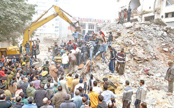انهار عقار مكون من 14 طابقاً في ساعة مبكرة صباح أمس بمحافظة الإسكندرية. وقال مدير الأمن اللواء خالد غرابة إن قيادات المديرية ورجال الإنقاذ توجهوا إلى مكان الحادث لمحاولة إنقاذ الضحايا حيث رجح وجود خمس أسر داخل العقار المنكوب. وبينما بدأت عمليات رفع الأنقاض بالتعاون مع الأهالي، أعلنت وزارة الصحة المصرية أن العقار تم بناؤه حديثاً وأن فرق الإنقاذ تمكنت من انتشال جثة واحدة تصادف وجود صاحبها وقت انهيار المبنى لأخذ بعض متعلقاته من شقته. وفي الصورة، (أ ف ب) تجمع كثيف للأهالي لمساعدة فرق الإنقاذ في البحث عن أحياء. (كونا)