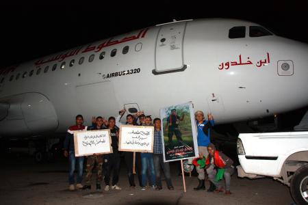منع عشرات الليبين يطالبون بالعدالة بعد مواجهات دامية في مدينة بني وليد، مساء السبت طائرة تابعة للخطوط الجوية التونسية من الاقلاع من مطار معيتيقة في طرابلس.