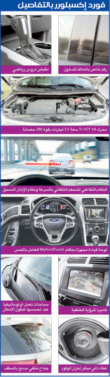 تلبية لرغبة عملاء فورد في تحسين تجربة القيادة على الطرقات، أسوة بالعديد من طرازات هذه الفئة من السيارات الرياضية متعددة الاستخدامات، أعيد تصميم طراز اكسبلورر في جيله الخامس بشكل تحسنت معه ديناميكية الحركة على الطريق وزيدت قدرات الدفع الرباعي فيه، وذلك من خلال تزويده بنظام تحكم تلقائي بالقيادة تبعاً لطبيعة الطريق والتضاريس الفريد، مع مجموعة من اختيارات تتيح الحد الأقصى من التماسك والتحكم في حالات القيادة على الطرقات الوعرة.تصميم جديد وتقنيات راحةصُممت إكسبلورر - داخلياً وخارجياً - بمهارة حرفية ذات مستوى عالٍ وزودت بقائمة واسعة من تقنيات الراحة والاتصالات والرفاهية لجميع الركاب. وهو أمر غير مسبوق في هذه الفئة. ومن أهمها نظام (آي فورد درايفر كونيكت تكنولوجي)، إضافة الى نظام (بلايند سبوت مونيتورينغ) أي مراقبة المنطقة العمياء بجوار السيارة، ونظام تثبيت السرعة التكيفي (أدابتيف كروز كونترول) الذي يقوم بمراقبة السيارات التي تسير في الأمام ونظام (أكتيف بارك أسيست) الذي يساعد السائق على الرؤية الخلفية.كذلك فإنّ إكسبلورر الحاصلة على جائزة السيارة الأكثر سلامة Top Safety Pick من معهد التأمين للسلامة على الطرقات السريعة IIHS، تتميّز ببنية مدمجة صلبة ومجموعة رائدة في الفئة من ميزات وتقنيات السلامة النشطة والكامنة، إضافة إلى ميزة سلامة مبتكرة من فورد ألا وهي أحزمة الأمان الفريدة من نوعها والقابلة للنفخ في مقاعد الصف الثاني.معايير جديدة لمحرك «V6»جهزت إكسبلورر قياسياً في طراز XLT موضوع التجربة، بمحرك من 6 أسطوانات بشكل V، وتبلغ سعته 3.5 ليترات. ويمتاز هذا المحرك بالاقتصاد في معدل استهلاك الوقود، إذ يستهلك وقوداً أقل بنسبة 20 في المئة عن محرك النسخة السابقة من إكسبلورر. وزود هذا المحرك بنظام الدفع الرباعي بجميع العجلات الذكي. وهذه الزيادة في الكفاءة ساعدت على تحقيق أدنى المعدلات في استهلاك الوقود أقل من باقي السيارات المنافسة في هذه الفئة.وجاء تحسين الأداء والكفاءة الديناميكية والاقتصاد في معدل استهلاك الوقود عبر تقنية (Ti - VST) من خلال حزام تشغيل منخفض الكثافة ومزودة بقابض ذي اتجاه واحد، إضافة الى مجموعة الصمامات المعتمدة على أوعية مصقولة من أجل تقليل الاحتكاك وبالتالي تخفيف وزن المحرك الذي يمتاز بانخفاض الاهتزازات والاحتكاكات والضوضاء.وتقدم فورد أيضاً محرك (إيكو بوست) من 4 أسطوانات بسعة 2 ليتر الذي يمتاز بتقنية الحقن المباشر والشحن التوربيني ليقدم أعلى مستوى من الأداء. وتصل القوة القصوى لهذا المحرك الى 237 حصاناً عند 5500 دورة في الدقيقة ويبلغ أقصى عزم دوران الى 250 رطل/قدم. ويعتمد محرك (إيكو بوست) على زيت (5 دبليو 30 جي اف4) الذي يمتاز بتقليل الاحتكاك وقلة نفقات التشغيل ولا يتم تغييره إلا بعد10 آلاف ميل.ناقل حركة بـ 6 سرعاتناقل الحركة اليدوي سداسي السرعات كتجهيز قياسي بصحبة كلا المحركين حيث يساهم هذا الناقل في تعزيز الأداء والاقتصاد في استهلاك الوقود ويمتاز بالمرونة في تغيير التروس حيث ان التروس المنخفضة توفر تسارعاً رائعاً من حالة التوقف التام بينما تساعد التروس العليا في زيادة الاقتصاد في استهلاك الوقود من خلال السماح للمحرك بالسير على سرعات منخفضة.كما يتوافر ناقل حركة أوتوماتيكي من طراز (سيليكت شيفت) بالنسبة لطراز (XLT) وطراز ليميتد، والذي يسمح للسائقين بتغيير التروس يدوياً باستخدام مفتاح التغيير. دفع رباعي ذكي ومتطورلم تعد الحرية المطلقة في اختيار تقنيات الدفع الرباعي مقتصرة على السيارات الفخمة متعددة الاستخدامات كالسابق، إذ تستخدم الطرازات المجهزة بالدفع الرباعي الذكي مع نظام التحكم بالقيادة حسب طبيعة التضاريس التقنيات الحديثة لمنح السائق شعوراً بالثقة والأمان في جميع الأحوال الجوية وعلى أنواع الطرقات كافة كما في إكسبلورر.ويقدم نظام التحكم بالقيادة حسب طبيعة التضاريس للسائق إمكانية الاختيار من بين مجموعة الخيارات الموجودة على لوحة التحكم المركزية، حيث يعطي كل خيا