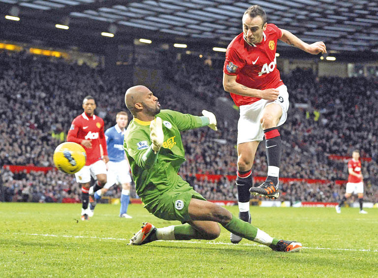 لحق مانشستر يونايتد حامل اللقب بجاره اللدود مانشستر سيتي الى الصدارة بفوزه الساحق على ضيفه ويغان 5-صفر، وسقوط الثاني في فخ التعادل امام مضيفه وست بروميتش البيون صفر-صفر امس، في افتتاح المرحلة الثامنة عشرة من الدوري الانكليزي لكرة القدم.ورفع مانشستر يونايتد رصيده الى 45 نقطة بفارق الأهداف خلف مانشستر سيتي.ففي المباراة الأولى، على ملعب «اولترافورد»، تابع مانشستر يونايتد نتائجه الرائعة وحقق فوزه الثامن في 9 مباريات والخامس على التوالي.وبكر مانشستر يونايتد بالتسجيل عبر الكوري الجنوبي بارك جي سونغ من تسديدة قوية من مسافة قريبة (8).وعزز برباتوف تقدم مانشستر يونايتد بهدف ثان عندما تلقى كرة من داورن غيبسون داخل المنطقة فهيأها لنفسه امام المرمى وتابعها داخل مرمى الحارس الدولي العماني علي الحبسي (42).وأضاف برباتوف هدفه الشخصي الثاني، والثالث لفريقه في الدقيقة 59 اثر تمريرة من انتونيو فالنسيا، فهيأها لنفسه داخل المنطقة، وسددها قوية بيمناه داخل المرمى، وعزز الأخير بهدف رابع اثر تمريرة من مايكل كاريك (75)، قبل ان يختم برباتوف المهرجان بهاتريك في الدقيقة 78 من ركلة جزاء ارتكبت على سونغ.واستفاد مانشستر يونايتد من خدمة وست بروميتش البيون ليلحق بمانشستر سيتي الى الصدارة.مباراة سلبية لسيتيوهي المرة الأولى التي يخفق فيها مانشستر سيتي في هز الشباك في احدى مباريات الدوري هذا الموسم، والأخرى في مختلف المسابقات بعد مباراته مع مضيفه بايرن ميونيخ الألماني في مسابقة دوري ابطال اوروبا.وكان مانشستر سيتي صاحب الافضلية طوال مجريات المباراة وسنحت لمهاجميه العديد من الفرص لكنهم تناوبوا على اهدارها. تشلسي يواصل نزيف النقاطوواصل تشلسي نزيف النقاط بسقوطه في فخ التعادل امام ضيفه وجاره فولهام 1-1 في دربي لندن على ملعب ستامفورد بريدج، في العاصمة وأمام 41581 متفرجا.وهو التعادل الثالث على التوالي لتشلسي، وبالنتيجة ذاتها، بعدما اخفق في مباراتيه الأخيرتين خارج قواعده امام ويغان وتوتنهام هوتسبر.وانتظر تشلسي حتى الدقيقة 47 لافتتاح التسجيل عبر لاعب الوسط الدولي الاسباني خوان ماتا.لكن فرحة اصحاب الأرض لم تدم سوى 9 دقائق، حيث تمكن فولهام من ادراك التعادل عبر نجمه كلينت ديمبسي.تعادل ليفربول وبلاكبيرنوأفلت ليفربول السادس من الخسارة على ارضه امام ضيفه بلاكبيرن روفرز صاحب المركز الأخير وخرج متعادلا معه 1-1.وكان بلاكبيرن روفرز البادئ بالتسجيل عبر لاعب وسطه تشارلي ادم، الذي حاول ابعاد كرة من ركلة ركنية فتابعها بالخطأ داخل مرمى فريقه (45).وأدرك الدولي الأرجنتيني ماكسيميليانو روبن رودريغيز التعادل في الدقيقة 53.وبقي ليفربول سادسا برصيد 31 نقطة بفارق نقطة واحدة امام نيوكاسل الذي ارتقى الى المركز السابع، بفوزه الثمين على مضيفه بولتون بهدفين نظيفين.وتعادل سندرلاند مع ايفرتون 1-1.