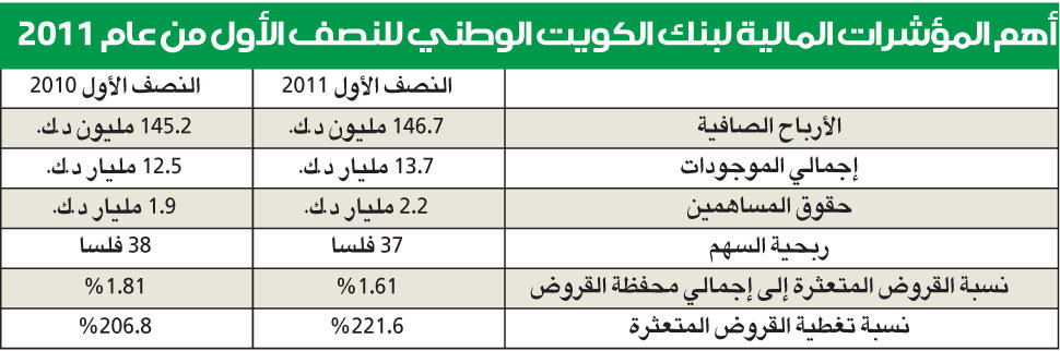 البحر: النتائج تثبت قوتنا رغم البيئة التشغيلية الصعبة وضعف النشاط الاقتصادياستقرت ربحية سهم البنك الوطني في النصف الأول من العام الحالي عند 37 فلساً للسهم الواحد. وارتفعت موجودات البنك الإجمالية بواقع 9.2 في المئة إلى 13.7 مليار دينار كويتي، بينما ارتفعت قيمة حقوق مساهميه 18 في المئة لتصل إلى 2.2 مليار دينار كويتي في نهاية يونيو 2011.